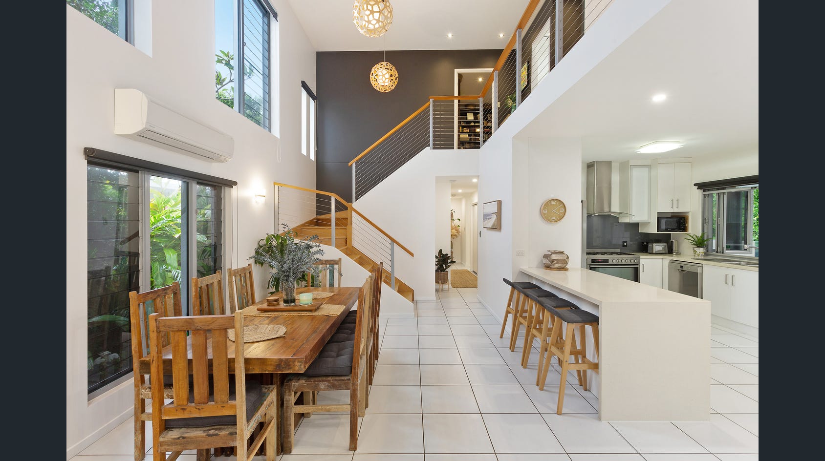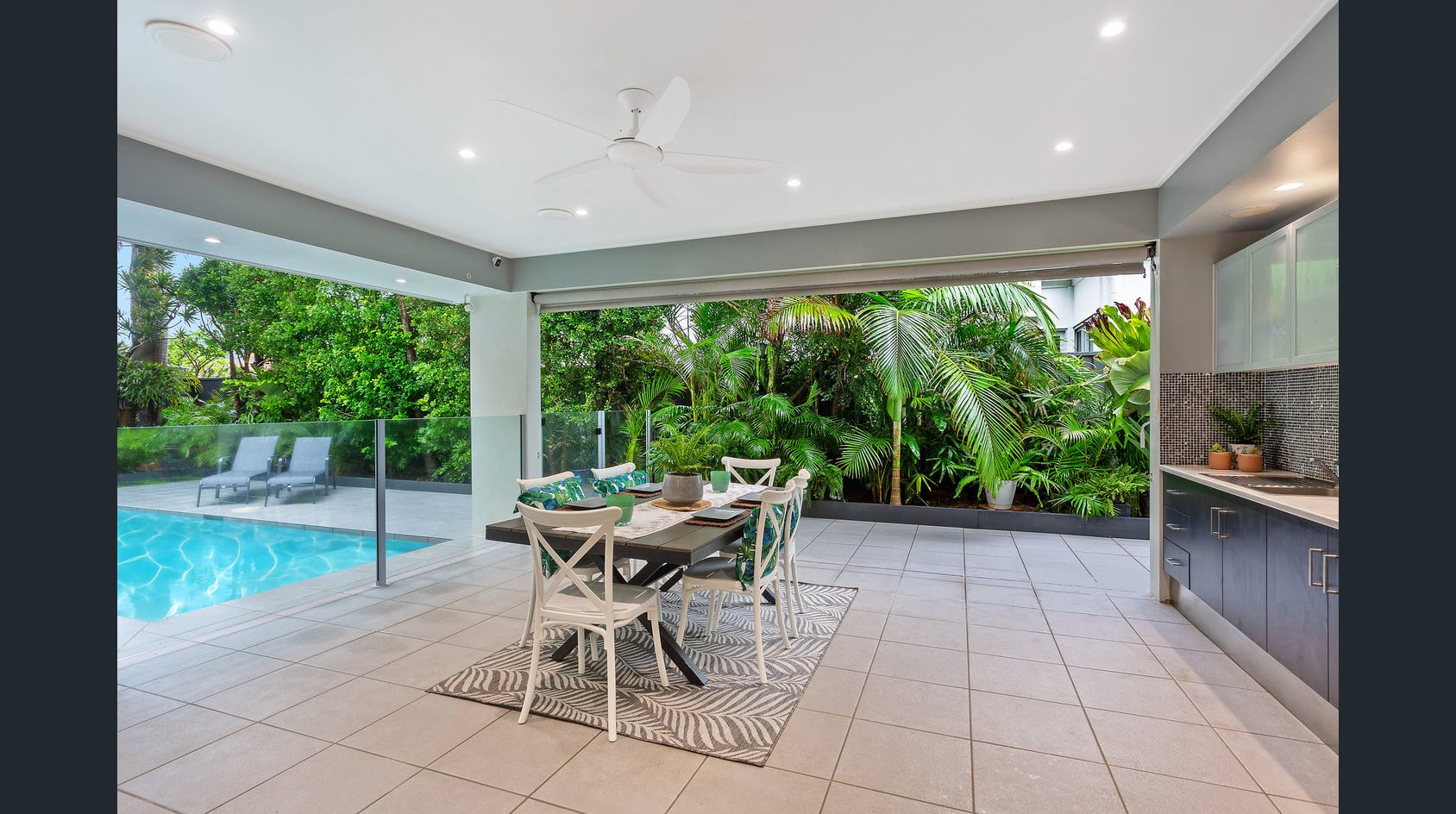 Functionality meets style in the heart of the home - the kitchen. Equipped with a gas cooktop, 900mm oven, wine rack, stone benchtops and screened servery window, it's perfect for preparing meals or entertaining, with the pool within eyesight.