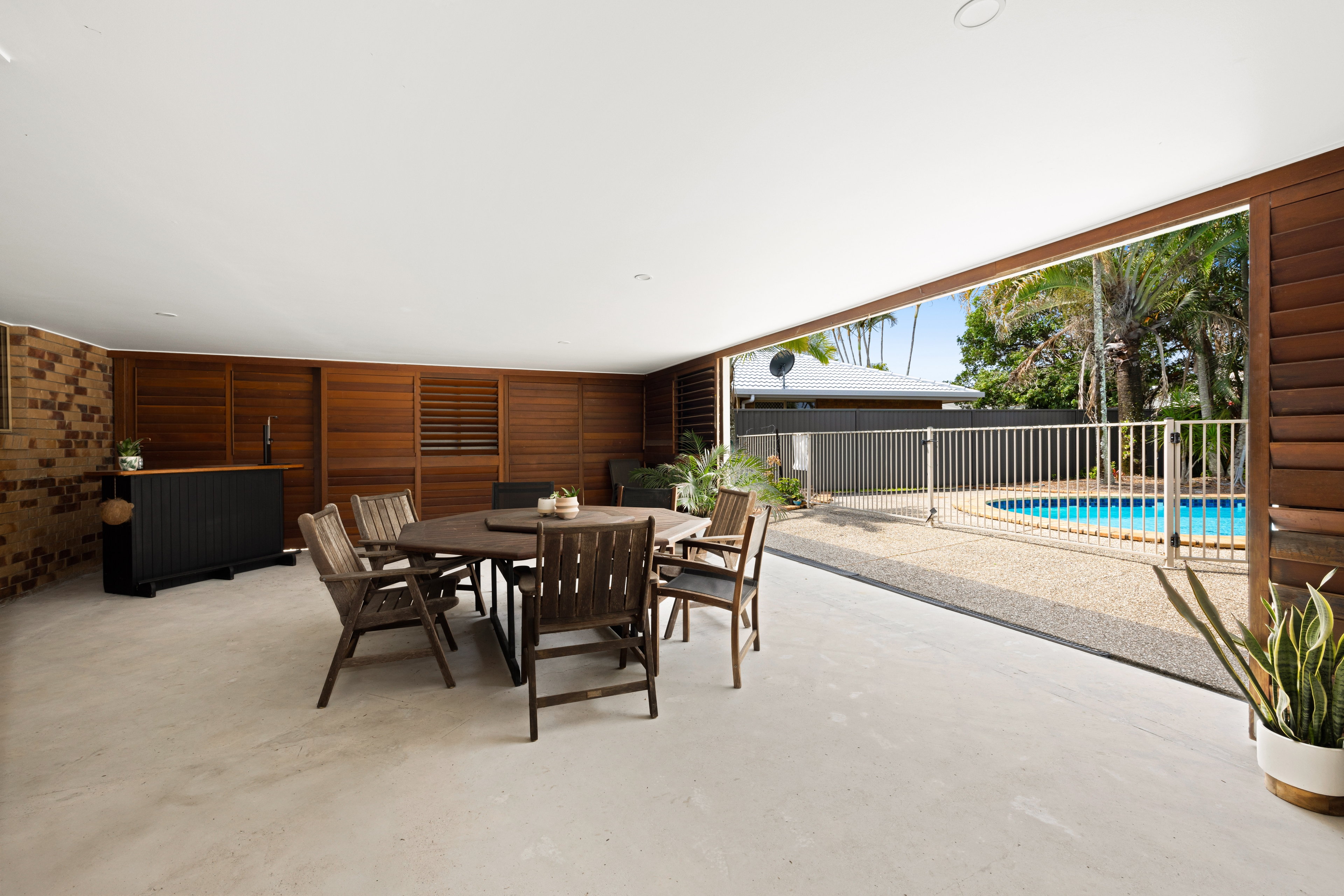 The layout includes a separate living area upon entry, an open kitchen, dining, and living area that flows seamlessly outdoors to the open entertaining area and the resort style pool.—ideal for relaxed coastal living or entertaining family and friends.