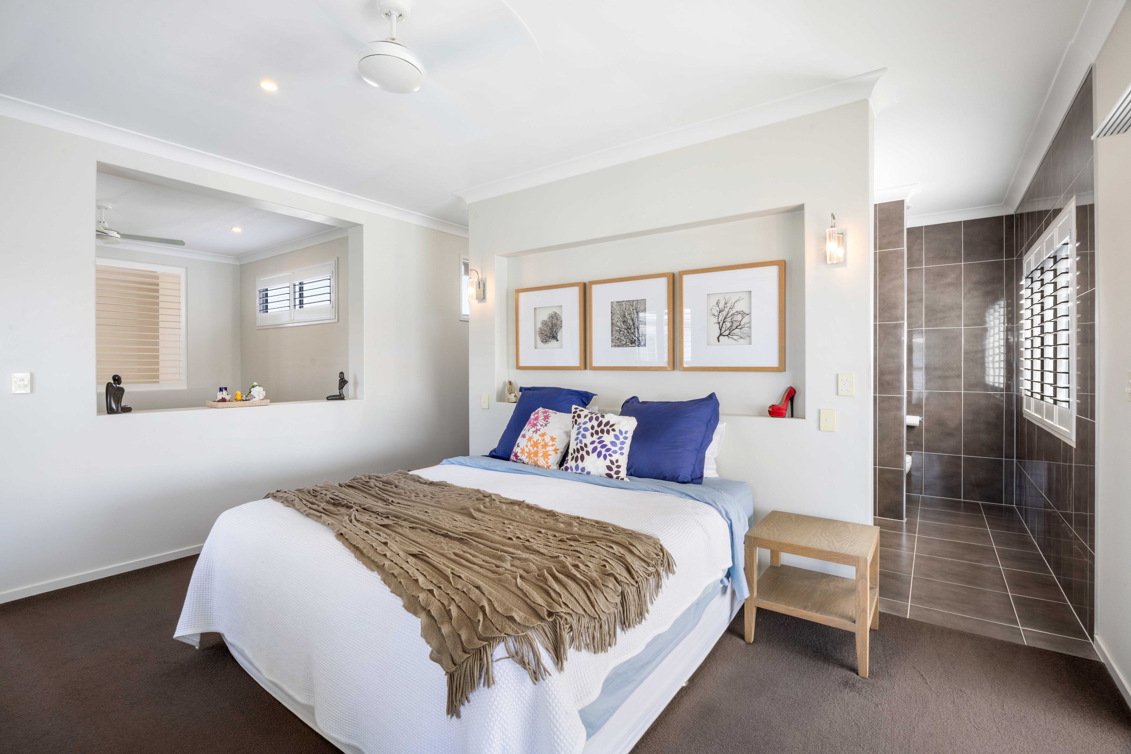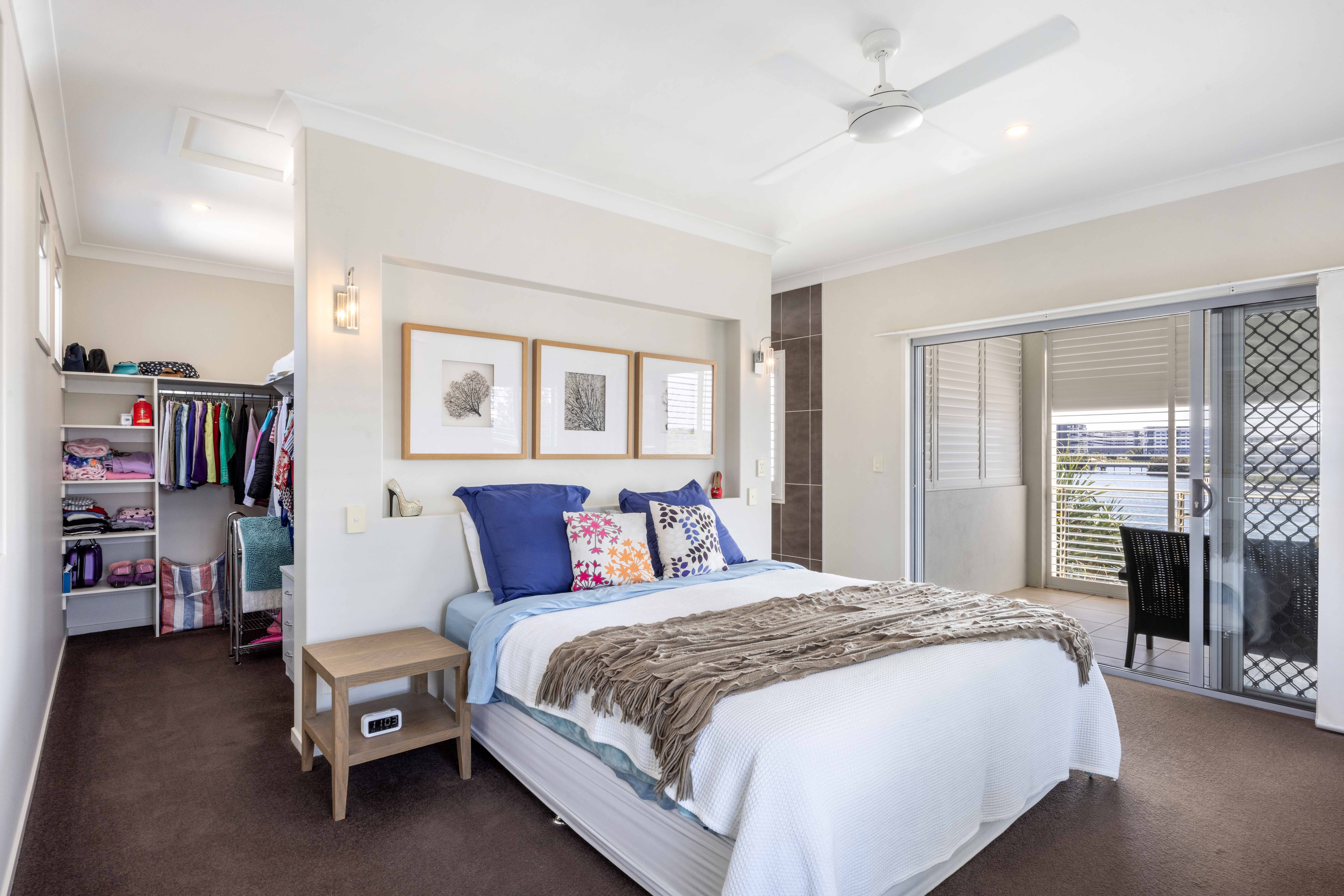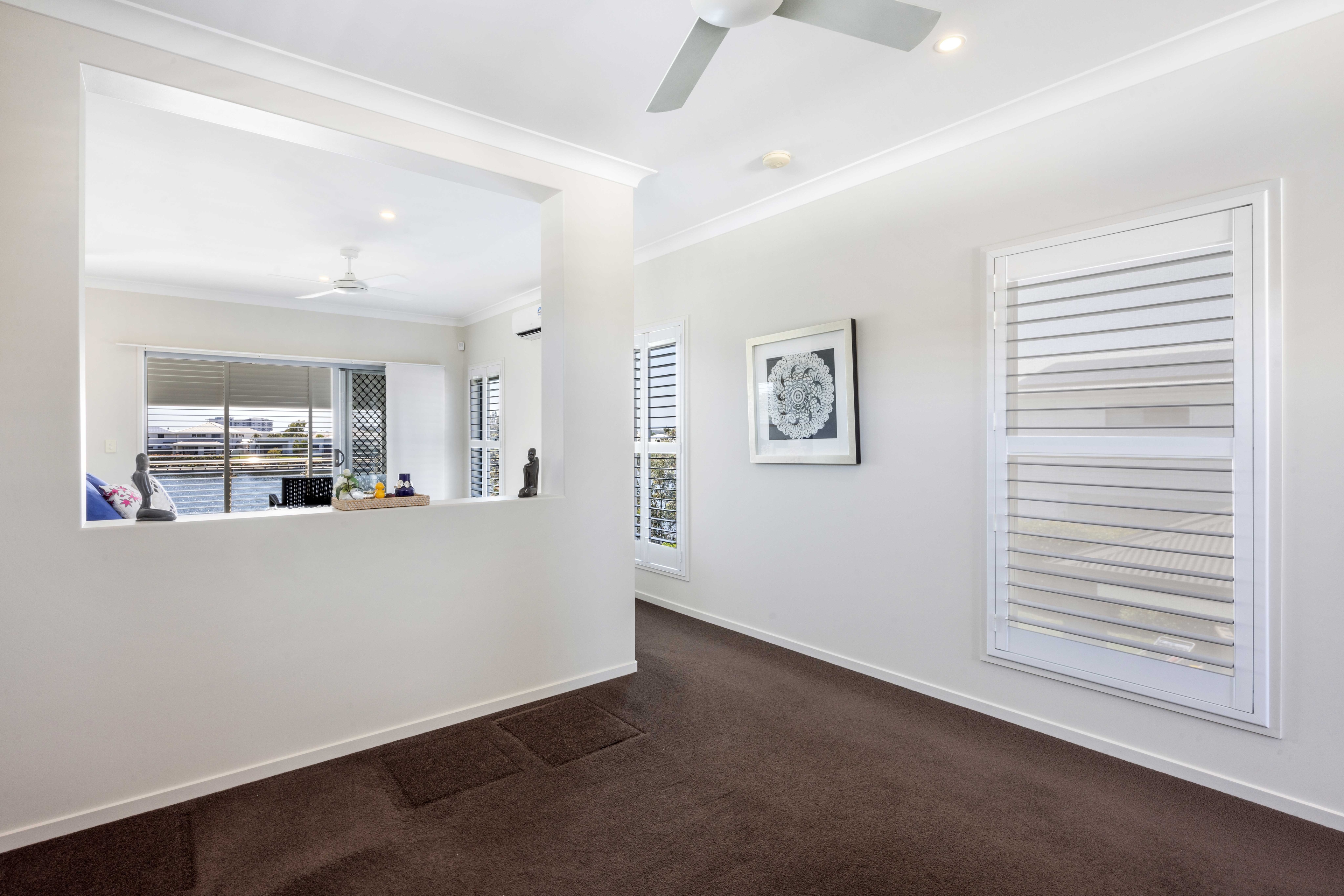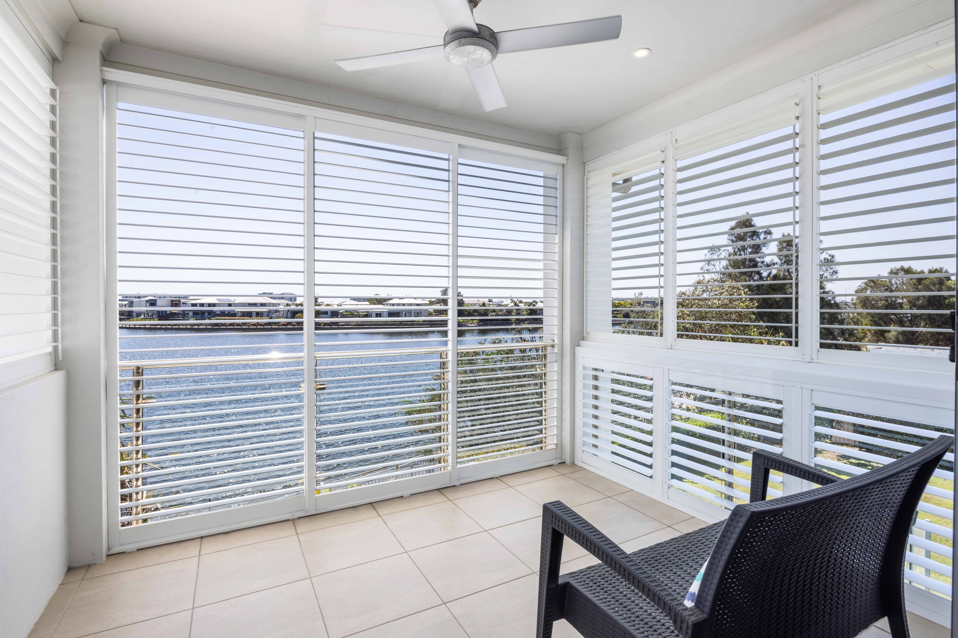 Upstairs, the master bedroom retreat awaits, complete with a versatile study or multi-purpose room. This haven boasts a large walk-in robe, plantation shutters, and balcony access offering panoramic north-facing lake views. The balcony, equipped with shutters for year-round comfort, extends the luxurious experience. The expansive ensuite bathroom features his and hers basins and a separate shower.
