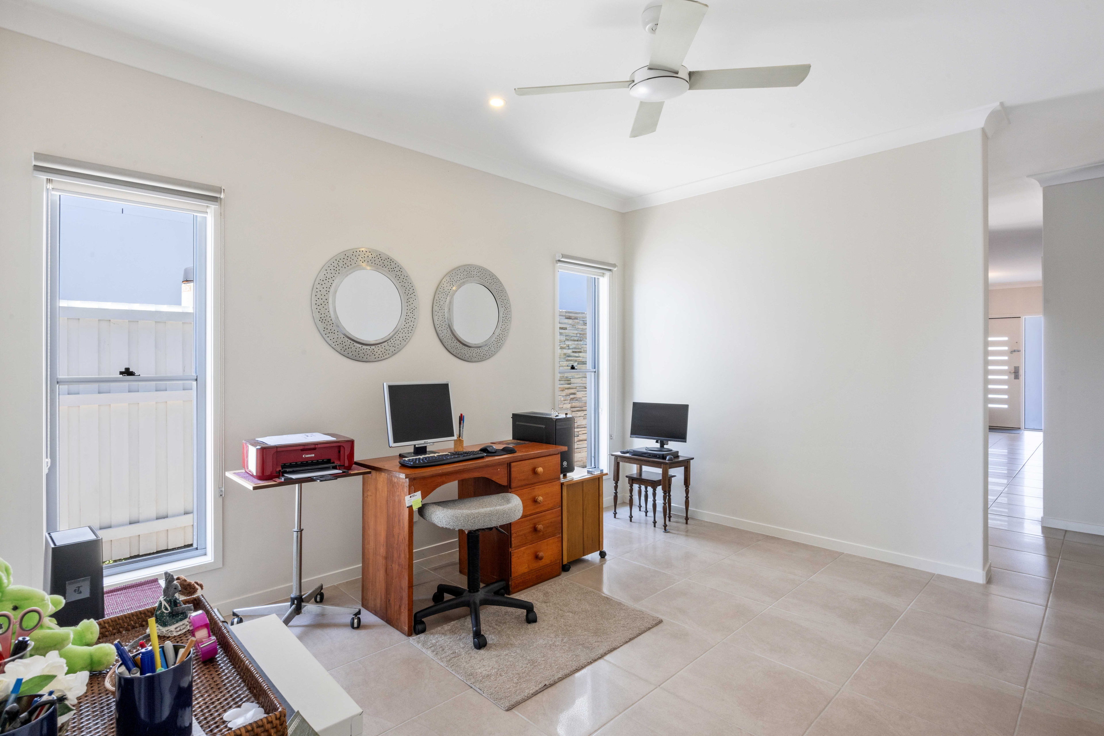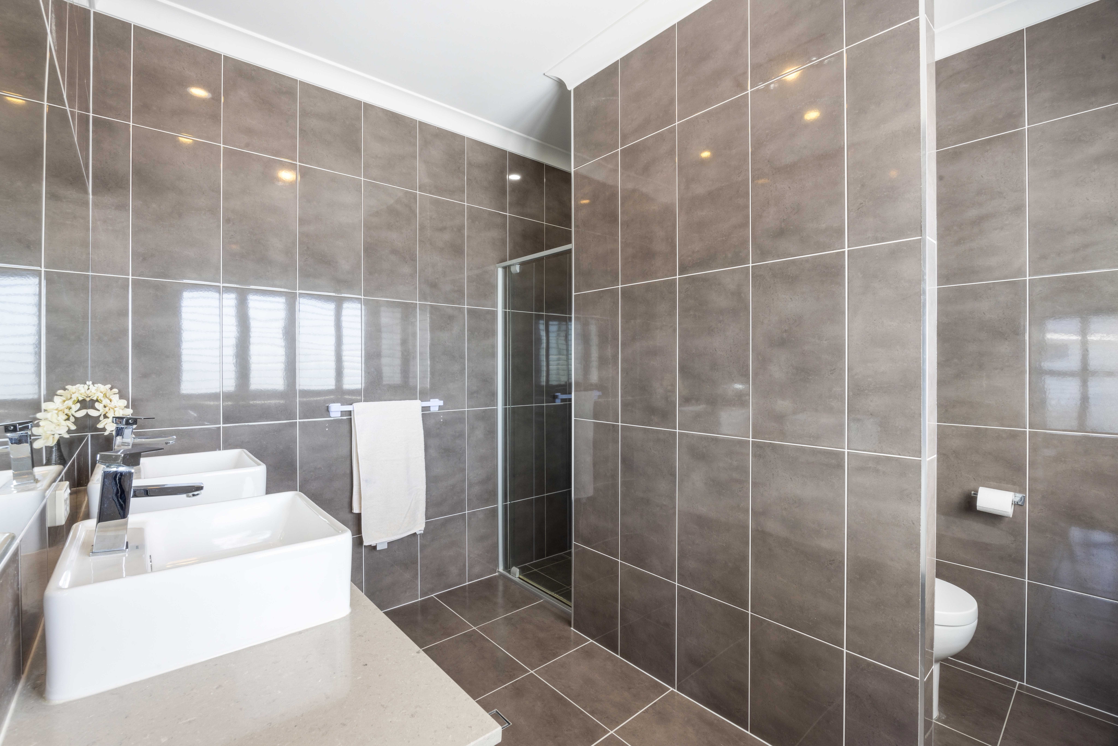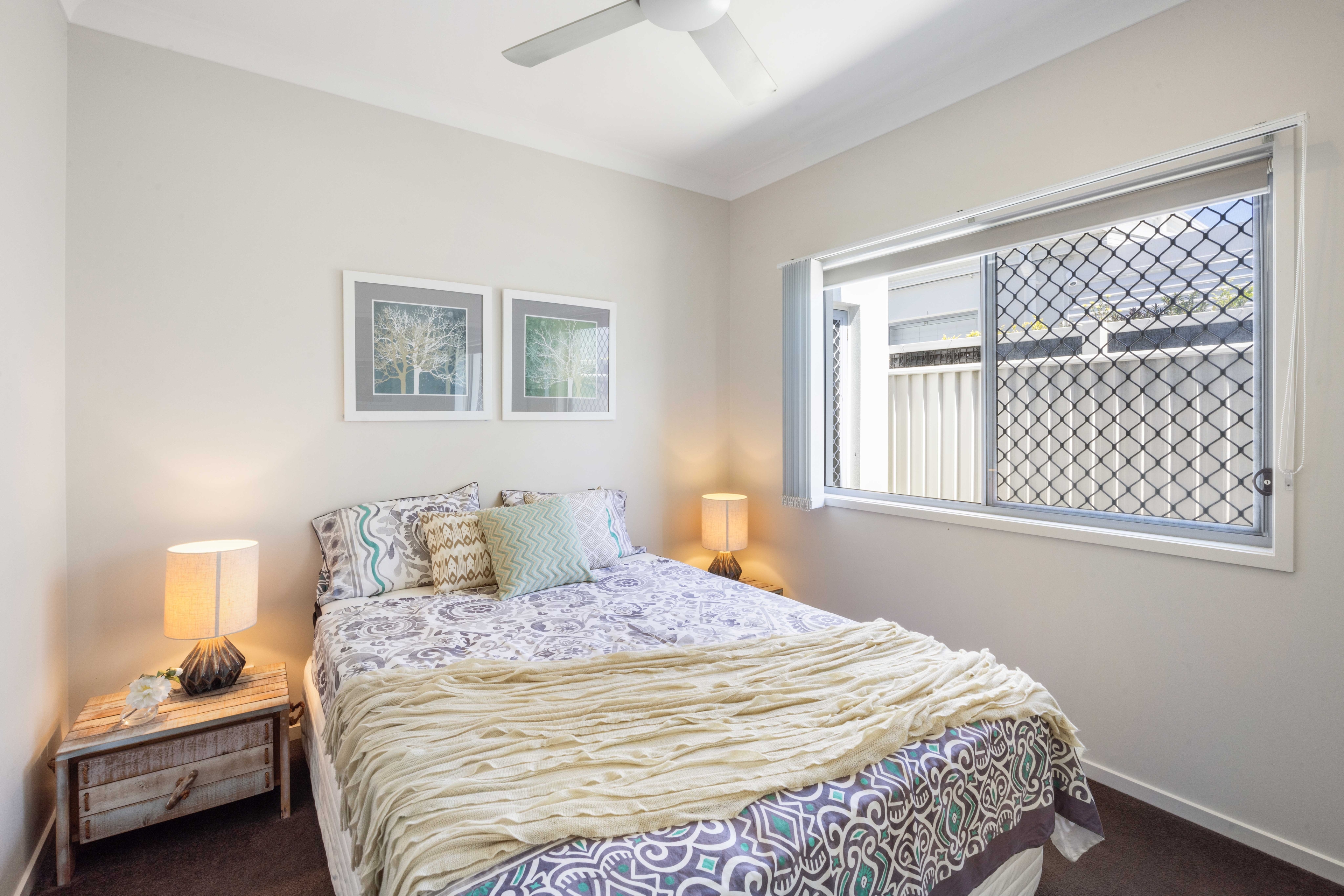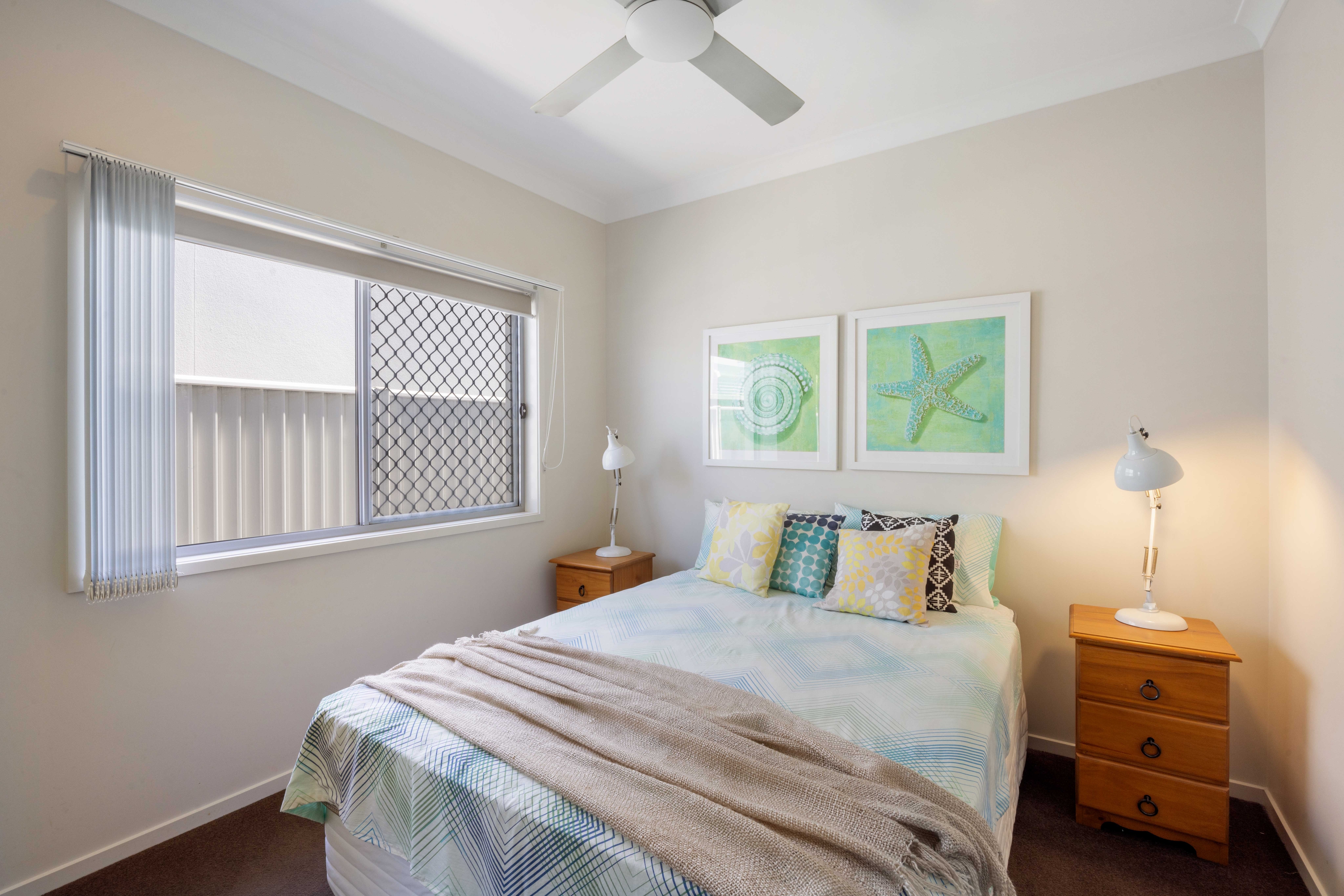Upstairs, the master bedroom retreat awaits, complete with a versatile study or multi-purpose room. This haven boasts a large walk-in robe, plantation shutters, and balcony access offering panoramic north-facing lake views. The balcony, equipped with shutters for year-round comfort, extends the luxurious experience. The expansive ensuite bathroom features his and hers basins and a separate shower.