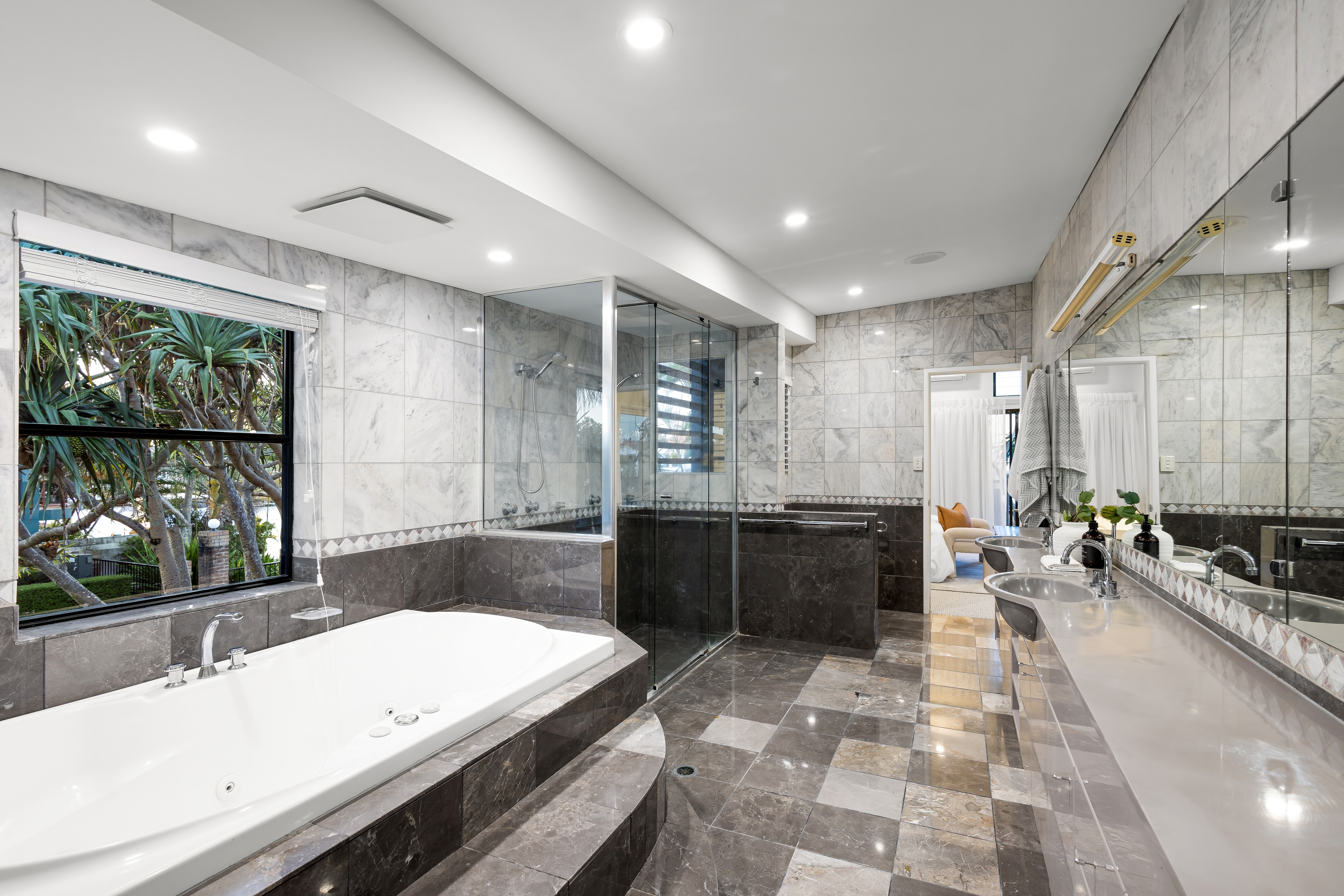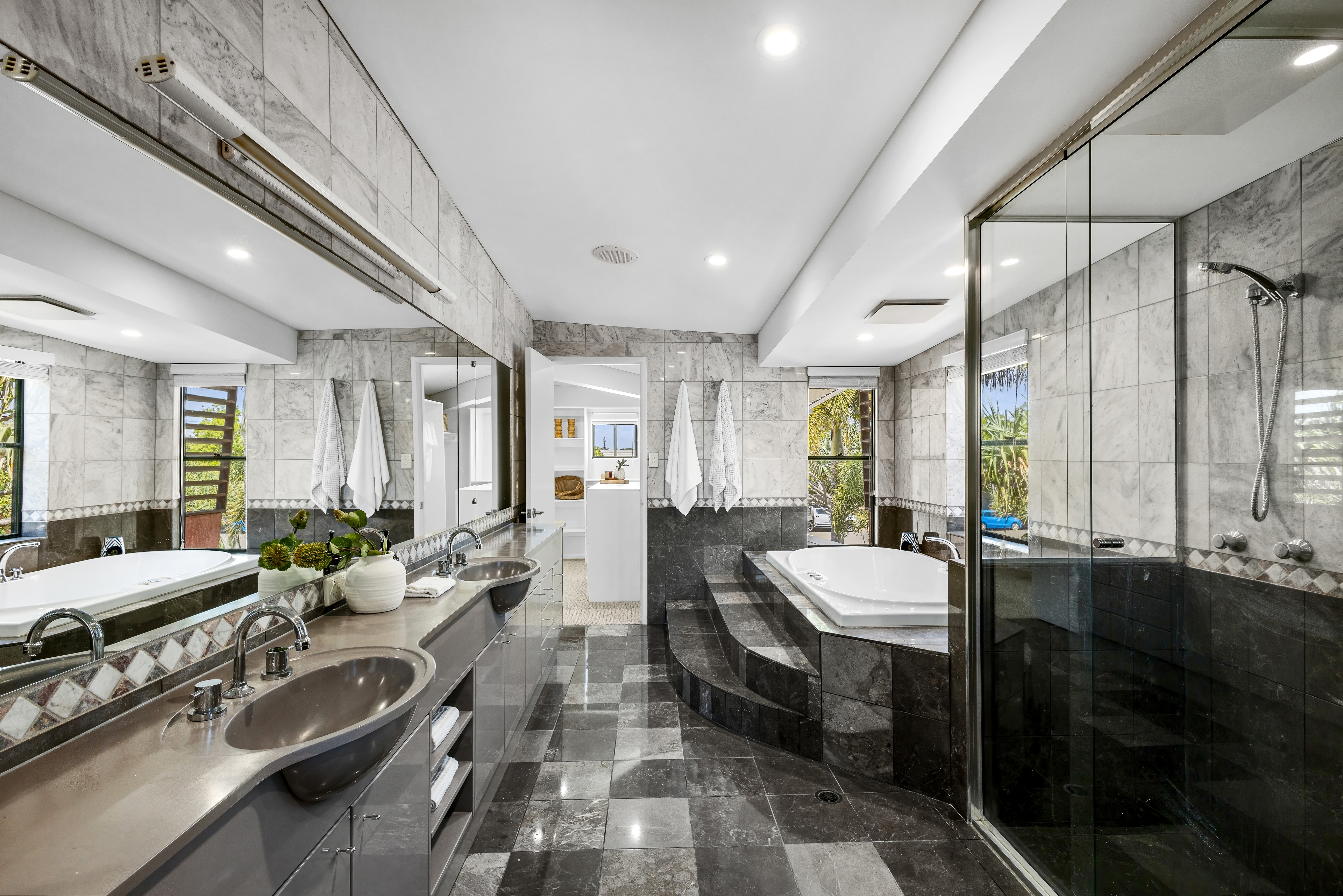 Situated over two levels, this well-proportioned family home offers 5 large bedrooms. Four are located on the upper level with the master offering ensuite, an ample walk-in robe and stunning water views down to Mooloolaba. There are a further 3 double bedrooms serviced by an additional bathroom with bathtub, shower and dual wash hand basins. There is a large 5x2 living room on this level with balconies to the master bedroom and to beds 2, 3 and 4.