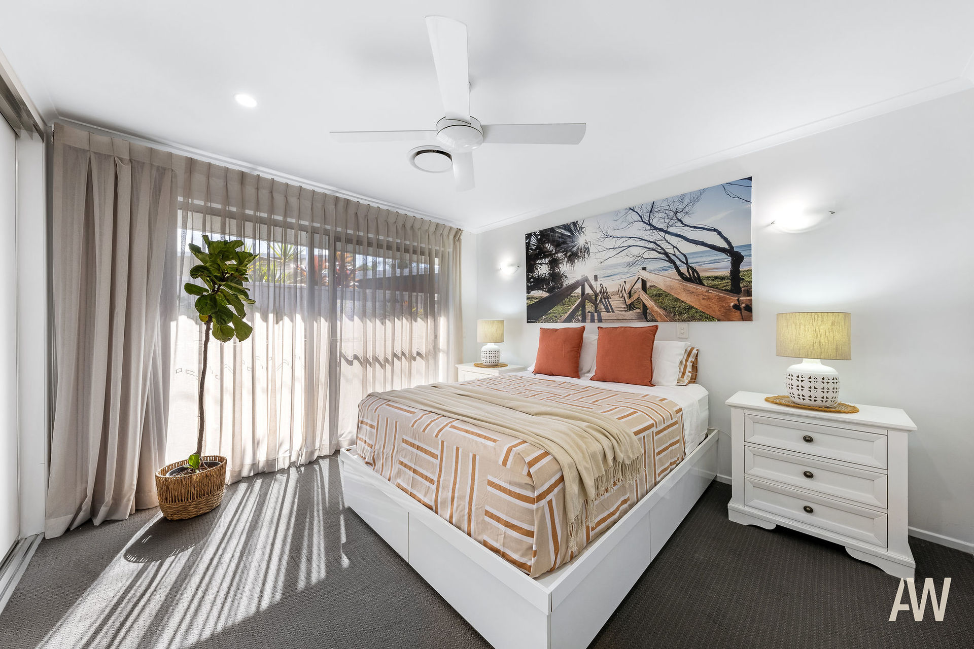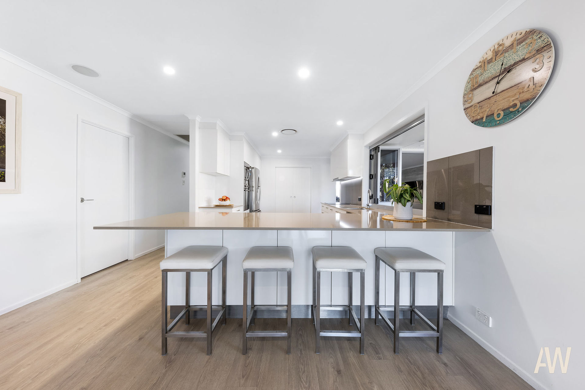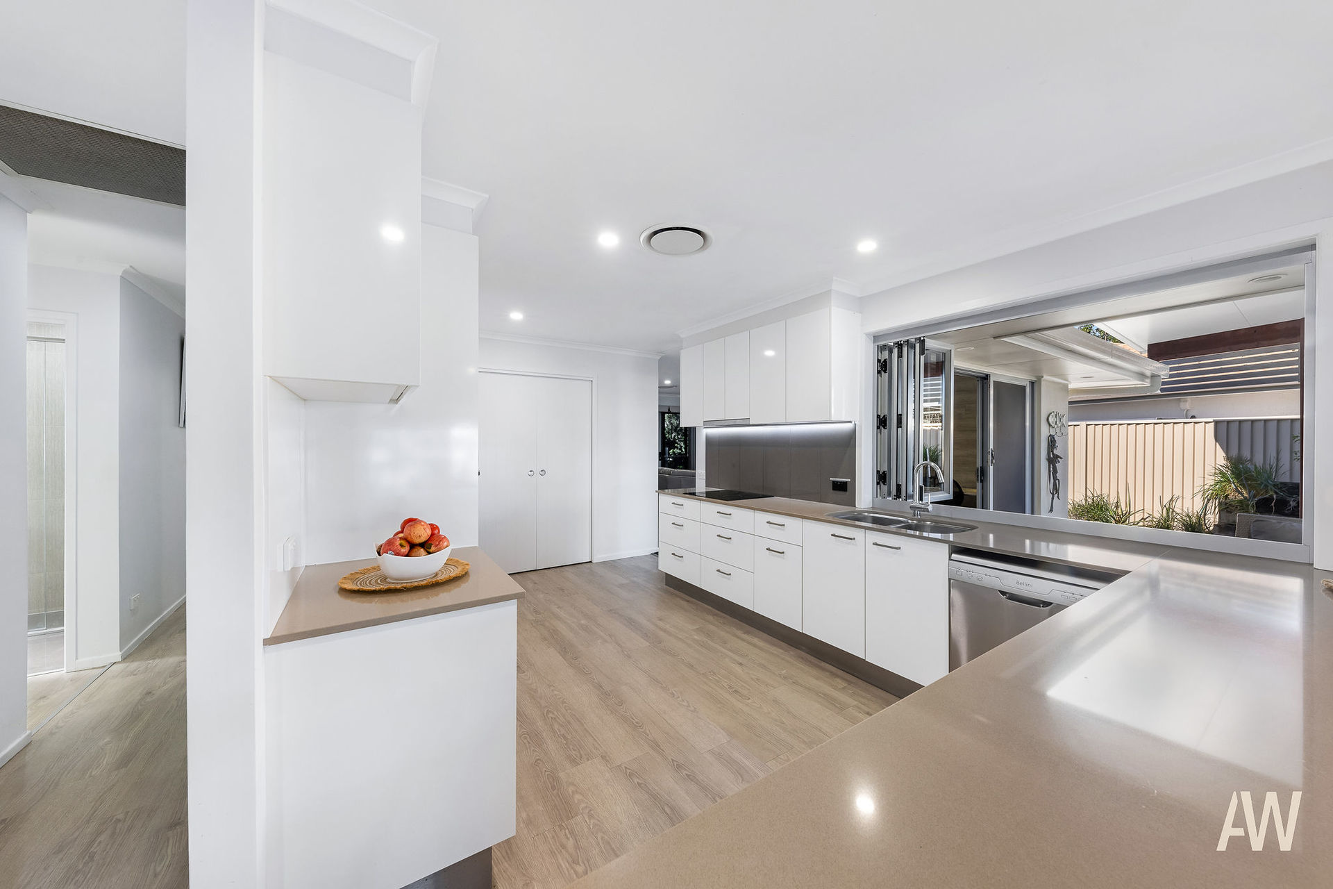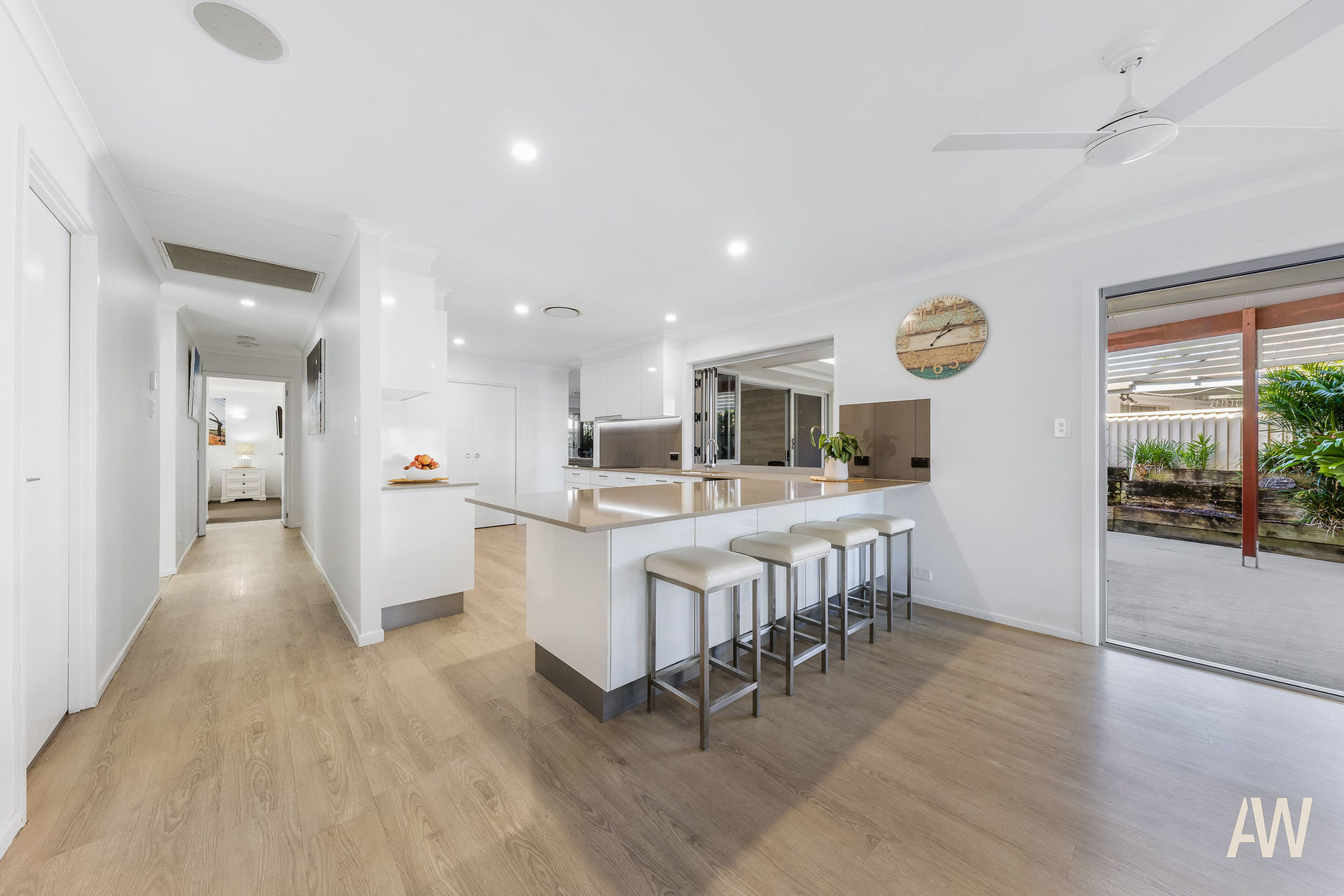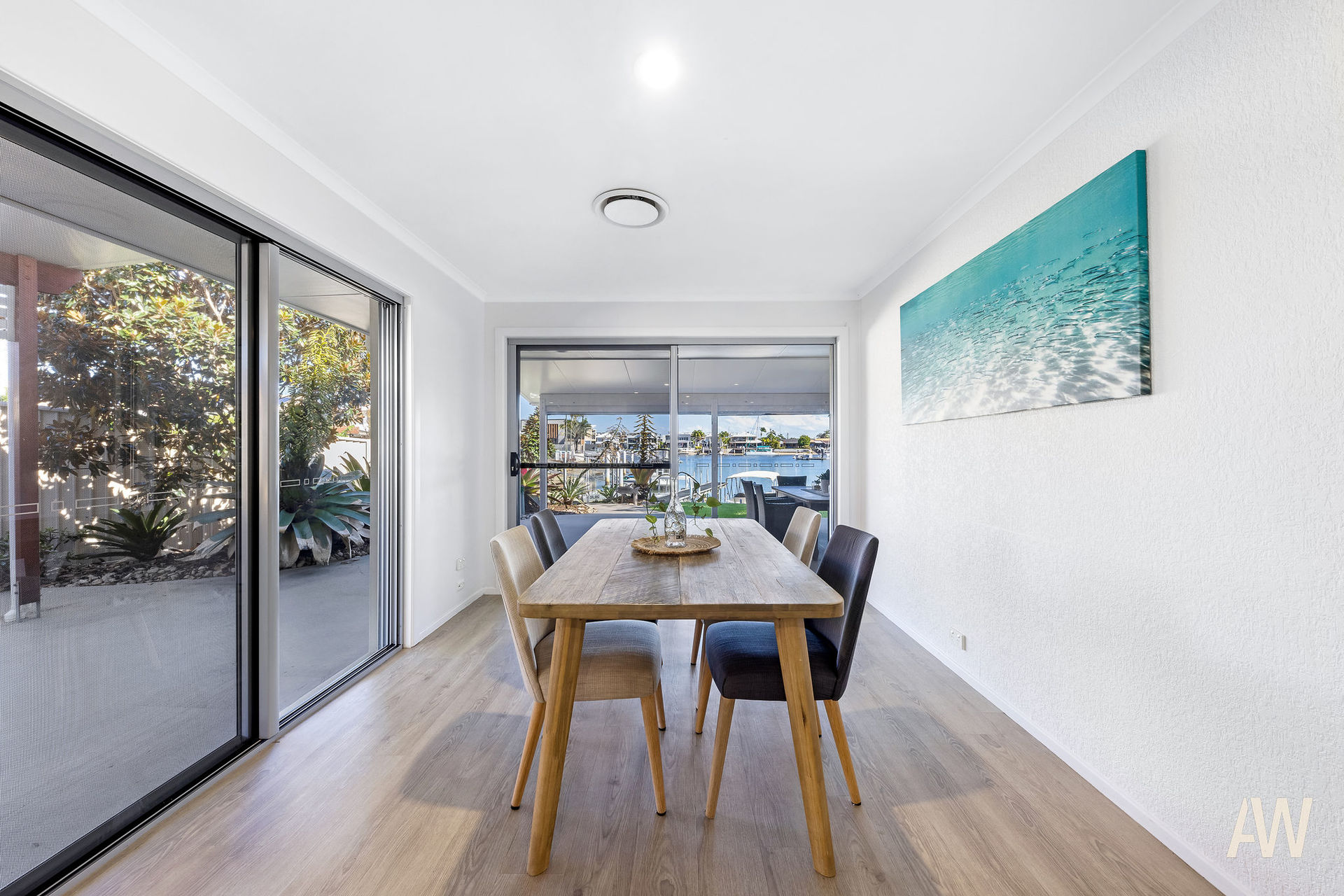 The guests' entrance is through the courtyard which also features a large in-ground pool whilst the main entry opens directly into the open-plan living zone capturing fresh canal breezes with fantastic cross ventilation. Finished in light neutral tones, the residence has been freshly painted throughout and epitomises laid-back coastal living. The kitchen is well appointed as the hub of the home in the centre offering ease of access to all living and entertaining zones both indoors and out. There is ample cupboard and bench space overlooking the dining area and further onto the broad water.