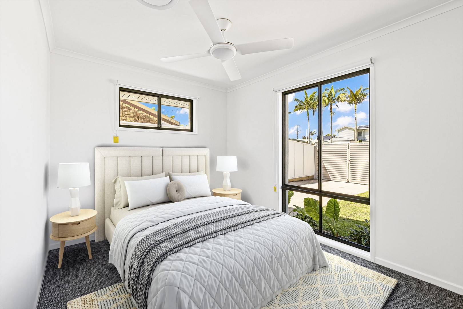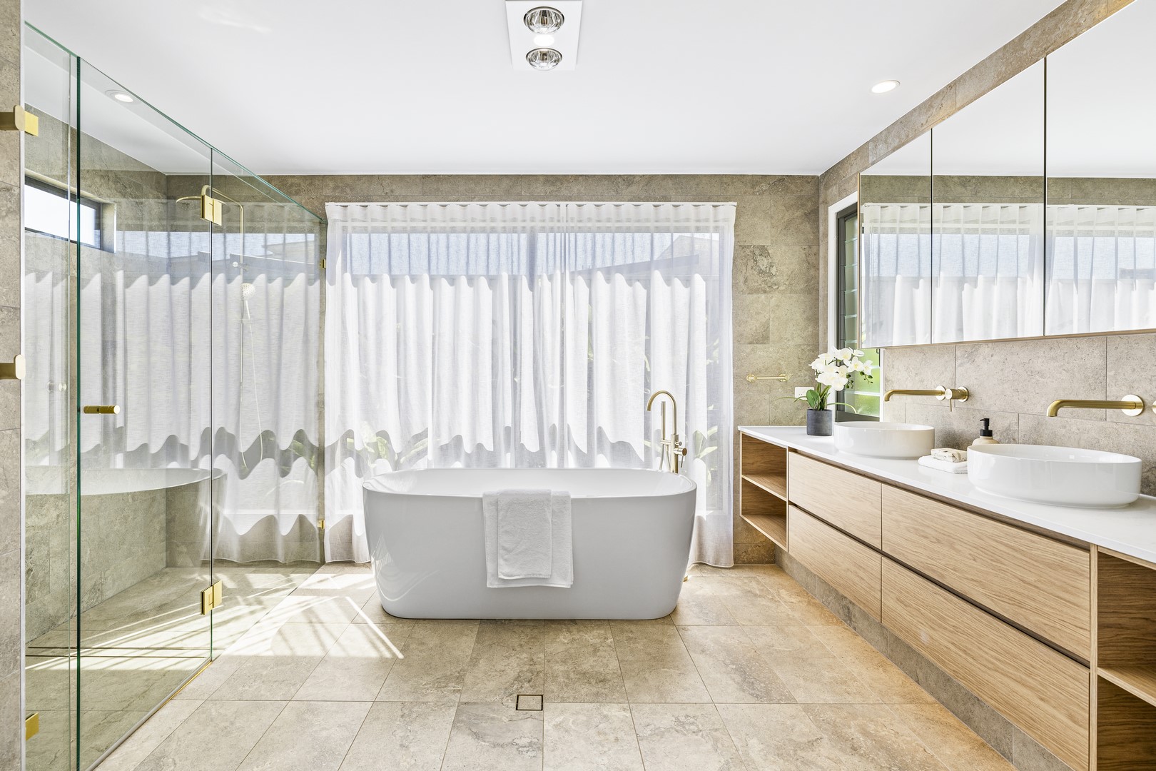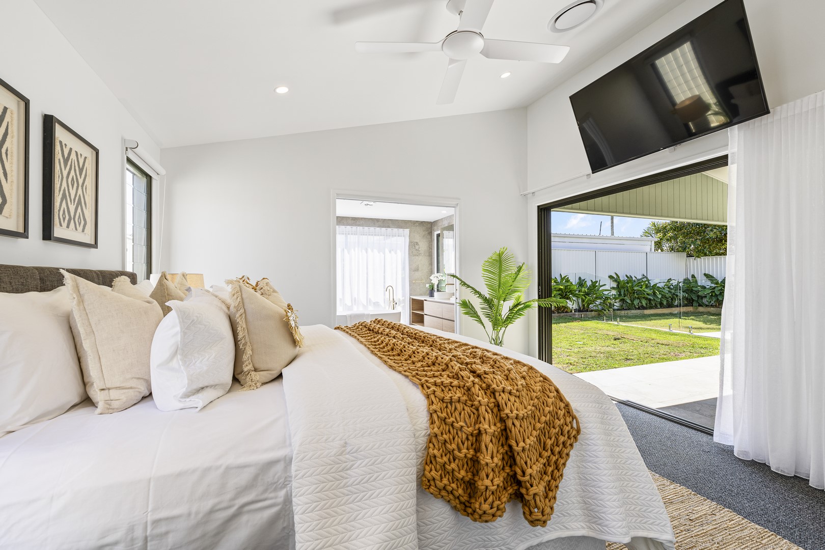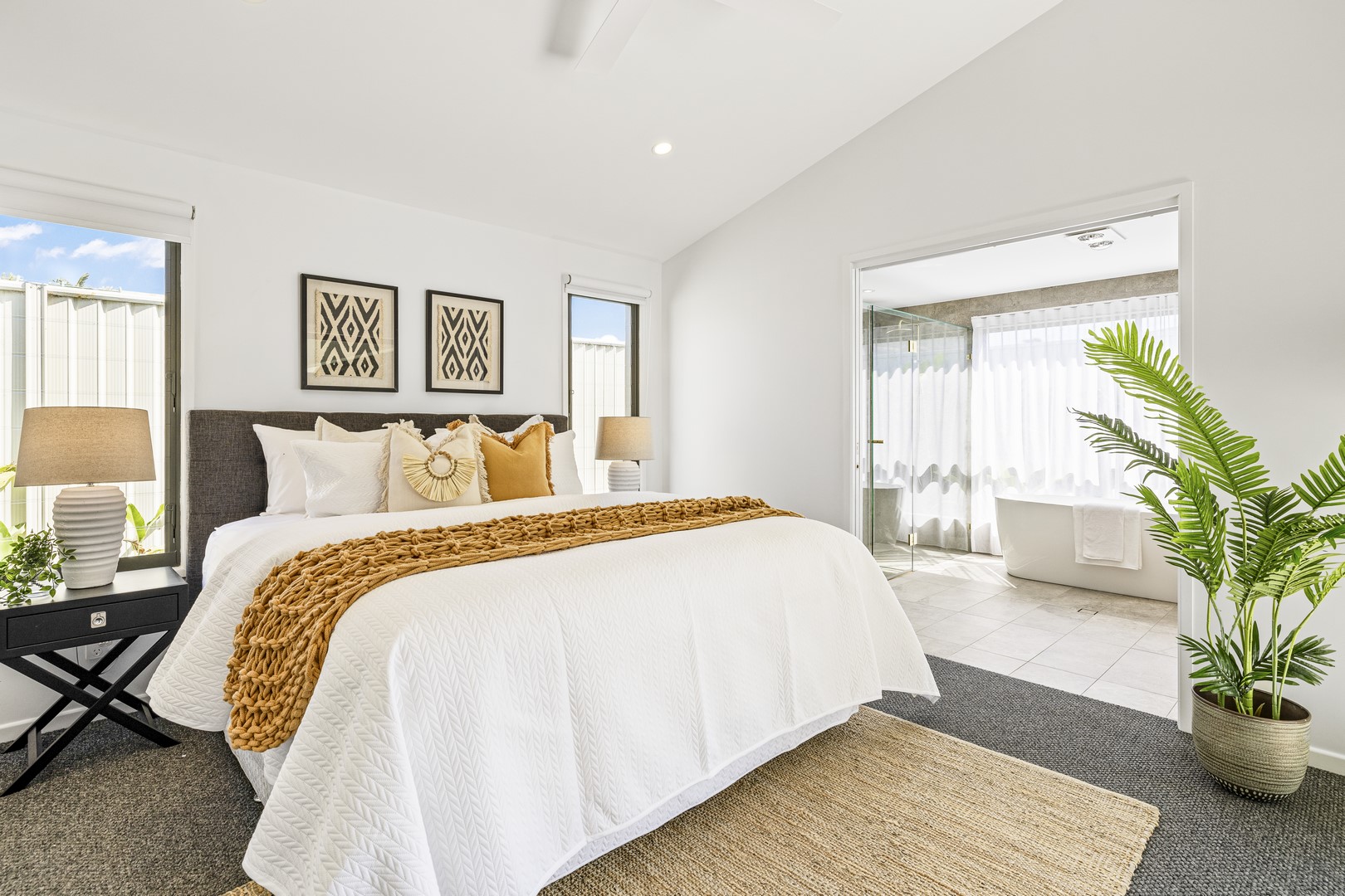 A window by the bathtub opens to a freshly planted garden filled with 'True Love' gardenias, set to bloom into a peaceful, fragrant oasis—creating the perfect serene escape. A second hot water system ensures the ensuite is always ready to go for relaxation when you need it most!