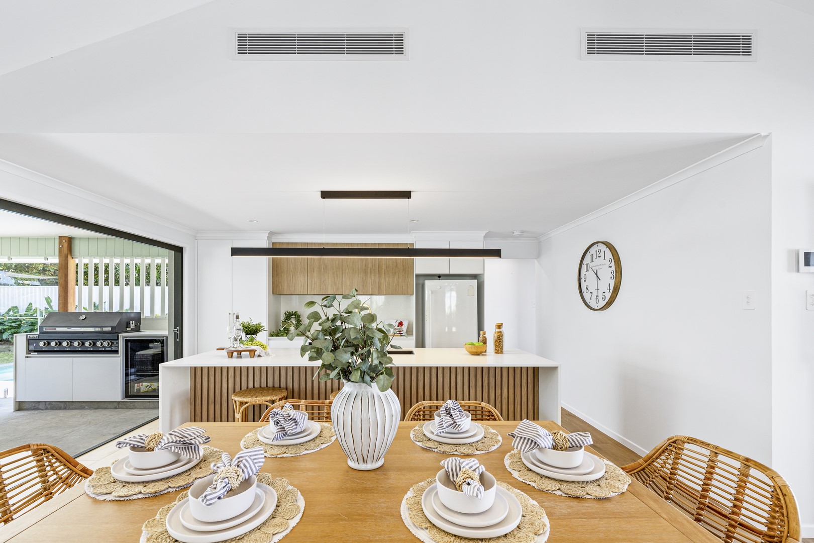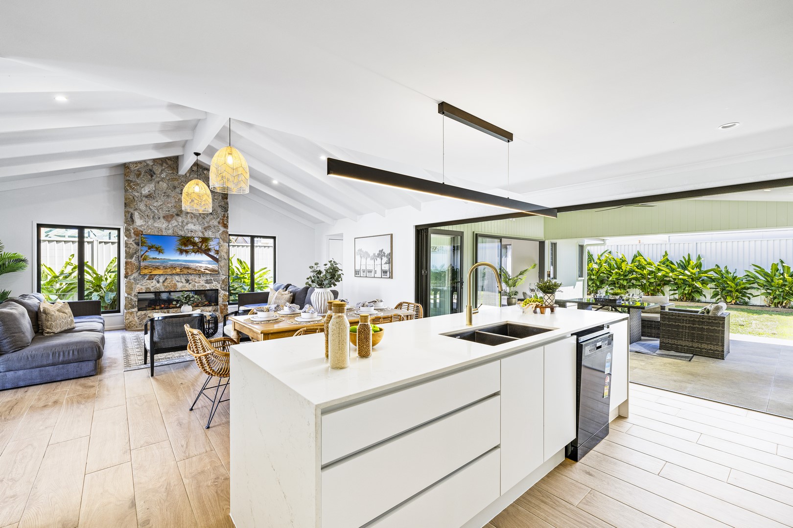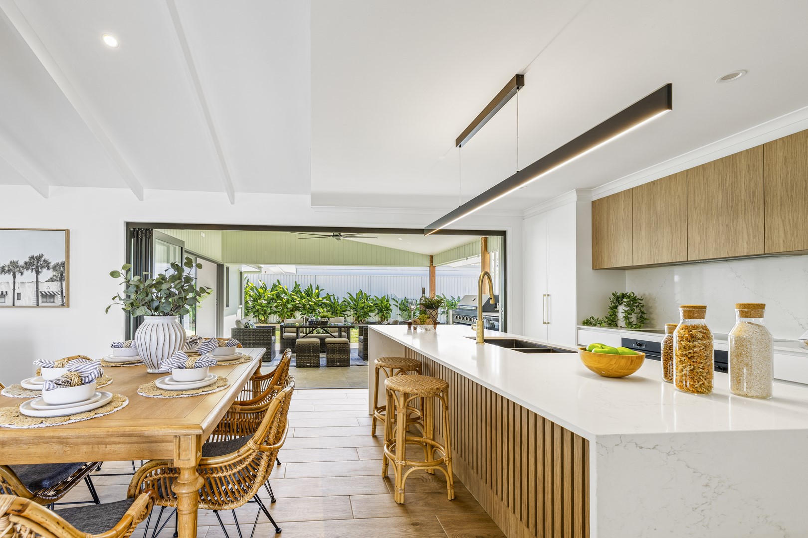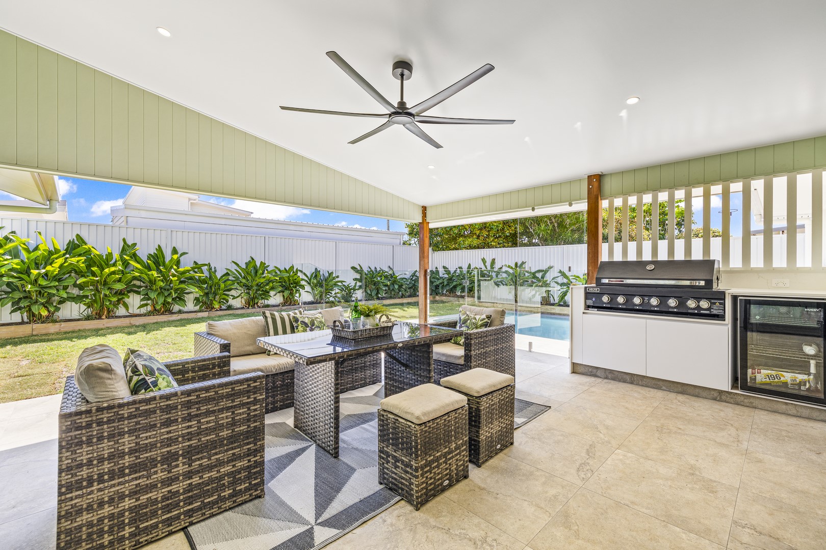 Stepping through the expansive 5-meter bifold doors into the alfresco area, it's effortless to picture hosting friends on a relaxed Saturday afternoon. Fire up your new Euro 6-burner BBQ as your favorite sports team plays on the wall-mounted TV, while the kids enjoy splashing in the brand-new pool. This space seamlessly blends indoor and outdoor living, perfect for creating memorable everlasting moments with family and friends.