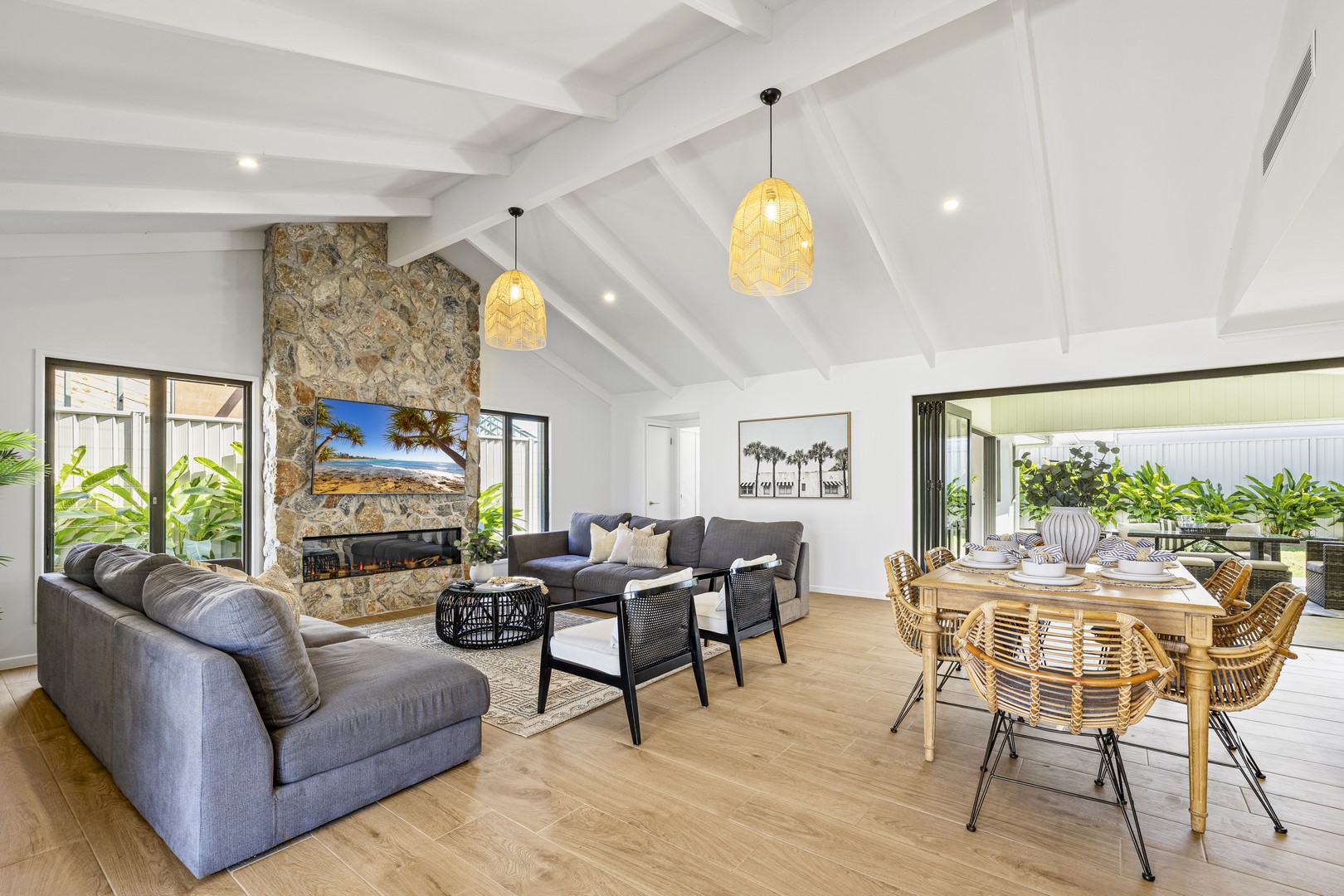 Upon stepping inside you are greeted by a warm, rustic yet modern ambiance, blending natural and contemporary elements. The original pitched ceiling with exposed hardwood rafters enhances the spacious and cozy atmosphere, while the natural stone feature wall adds earthy texture that complements the sleek electric fireplace.