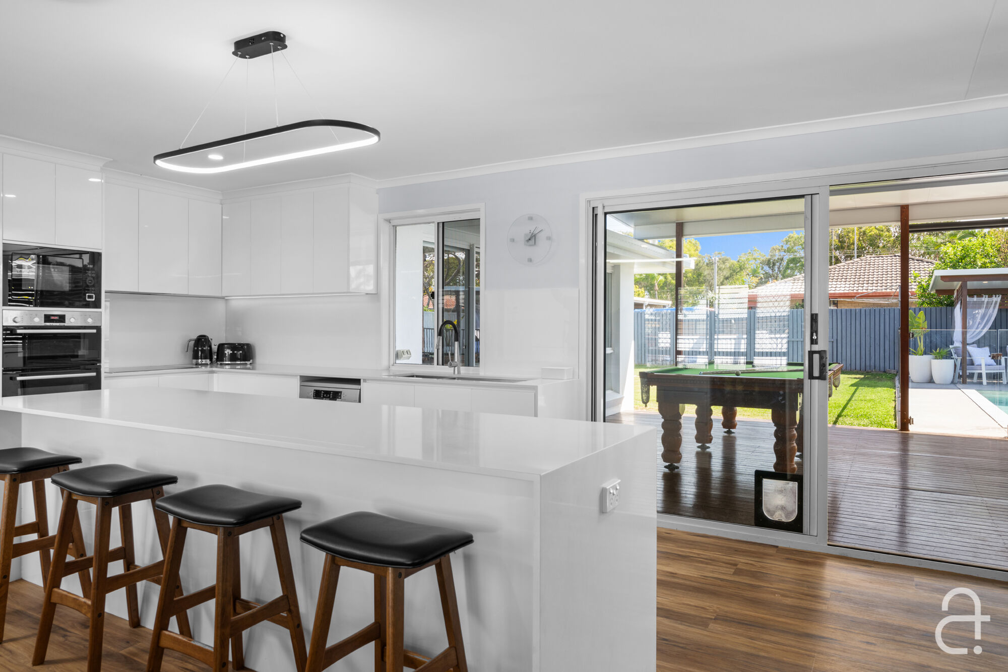 Step inside to find light-filled, open-plan living and dining areas that invite effortless flow to the stunning outdoor entertainment zones. The contemporary kitchen is a true masterpiece, featuring sleek stone benches, premium two-pac cabinetry, top-of-the-line appliances, and tranquil views across the sparkling private pool. In this space, culinary creations meet peaceful seaside living.