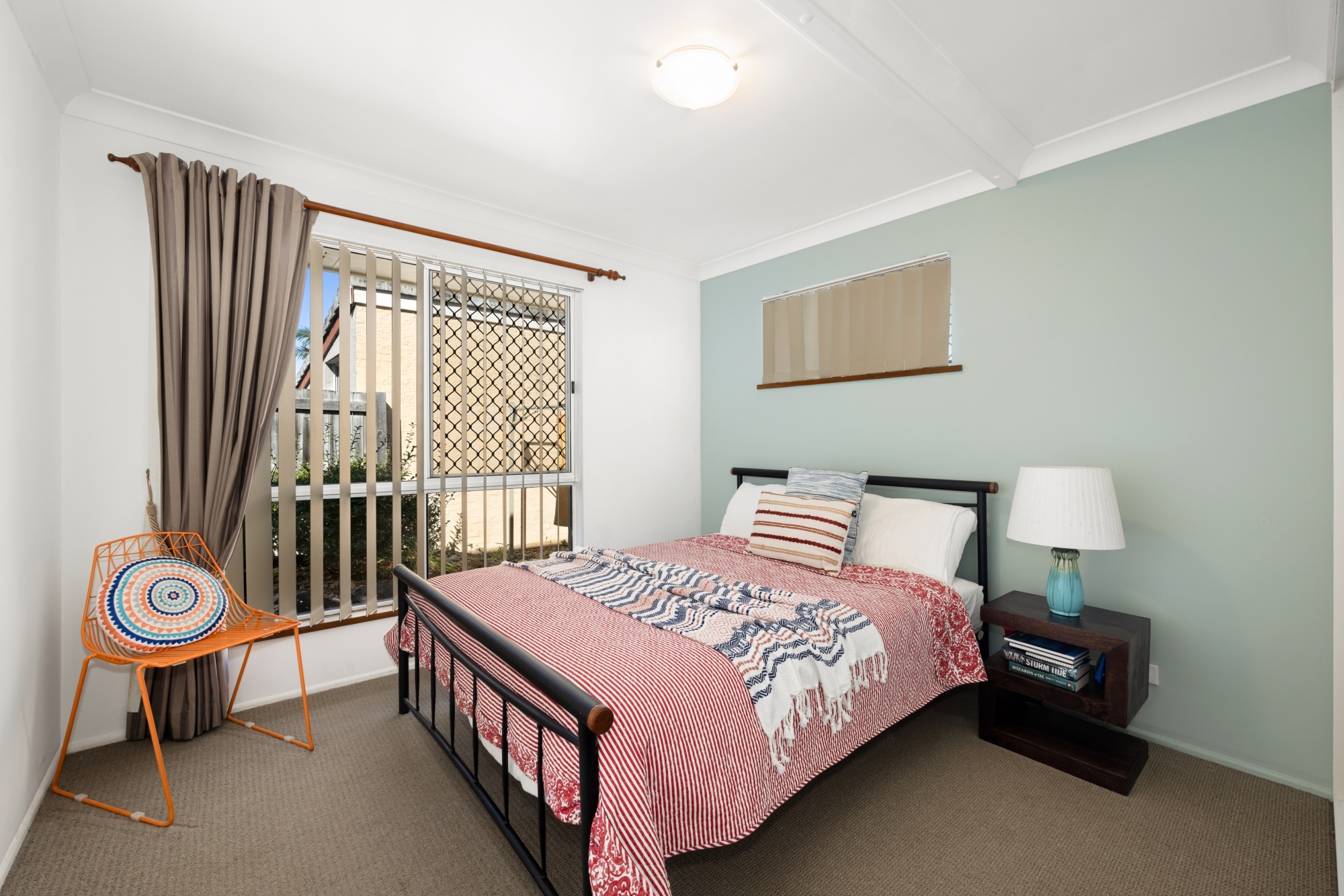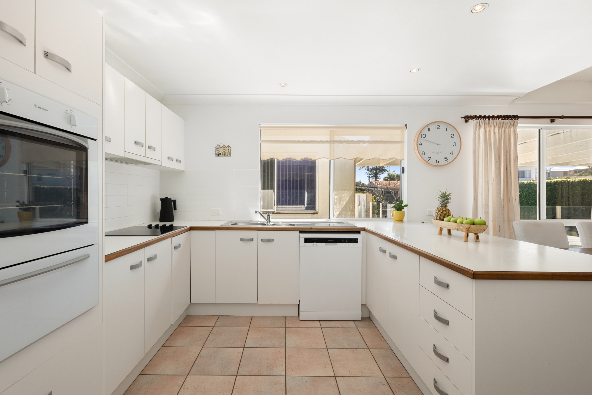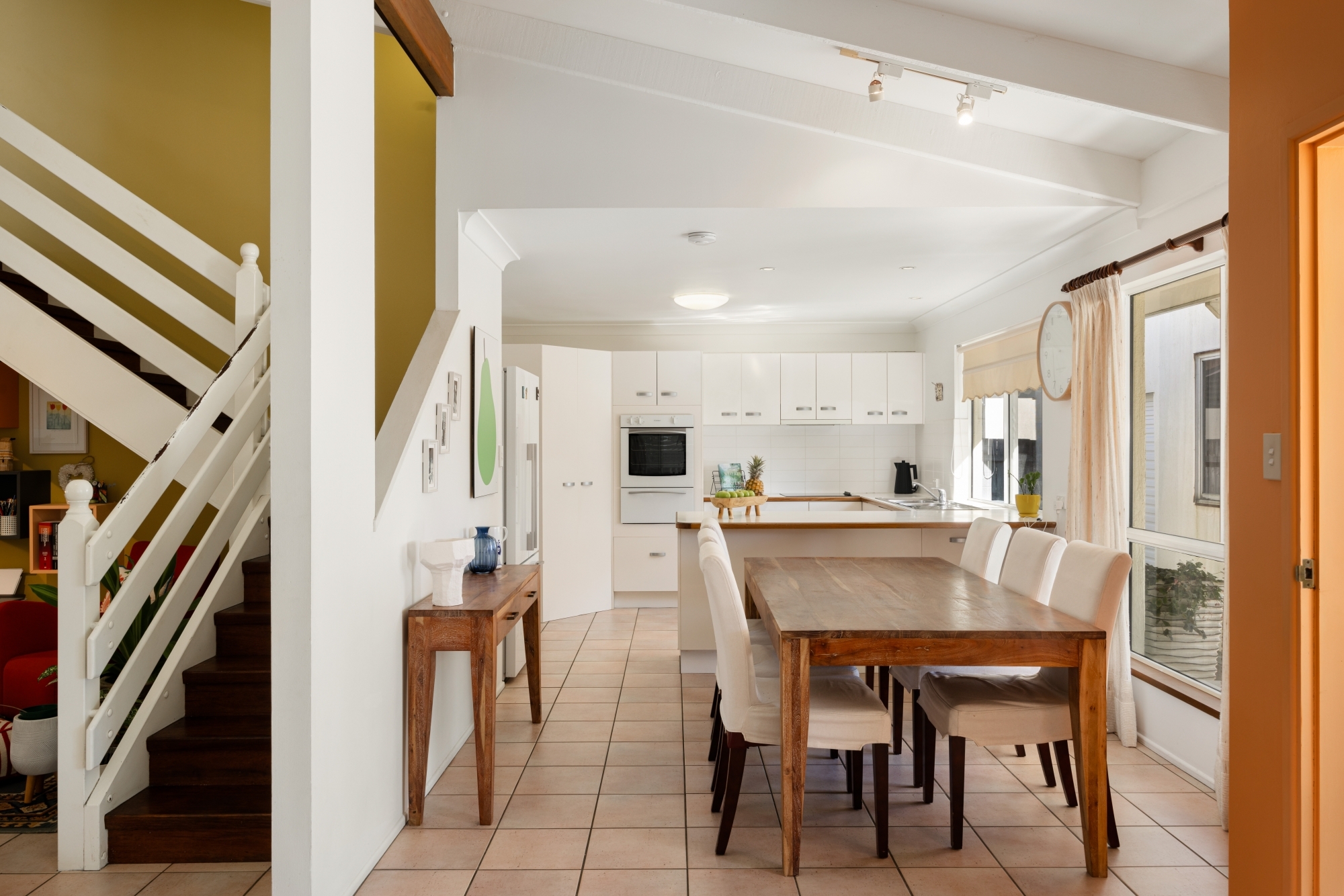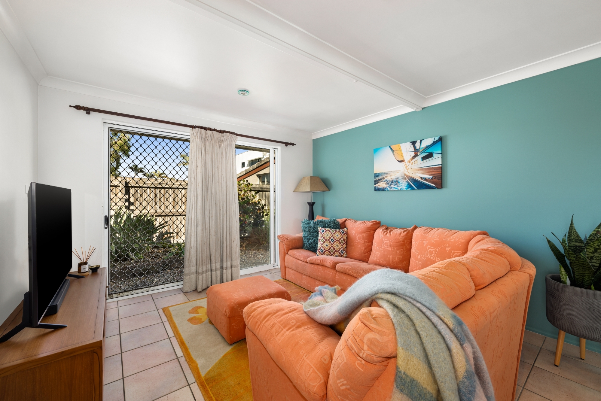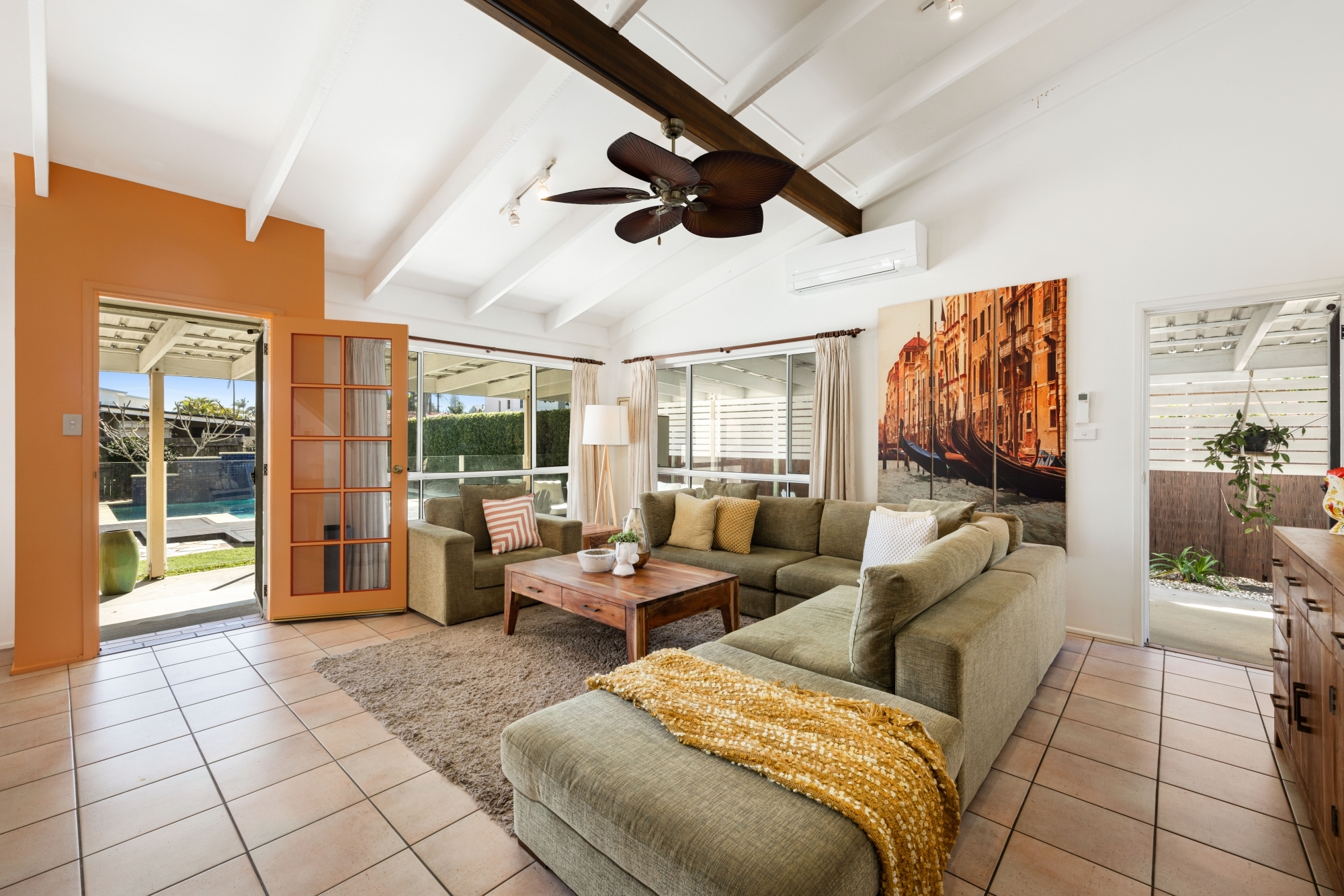 Inside, the home greets you with vibrant pops of mustard, coral, and gold tones creating a lively atmosphere in the combined lounge and dining areas. The spacious, open-plan kitchen is perfect as is, but also holds incredible potential for a beachside renovation.