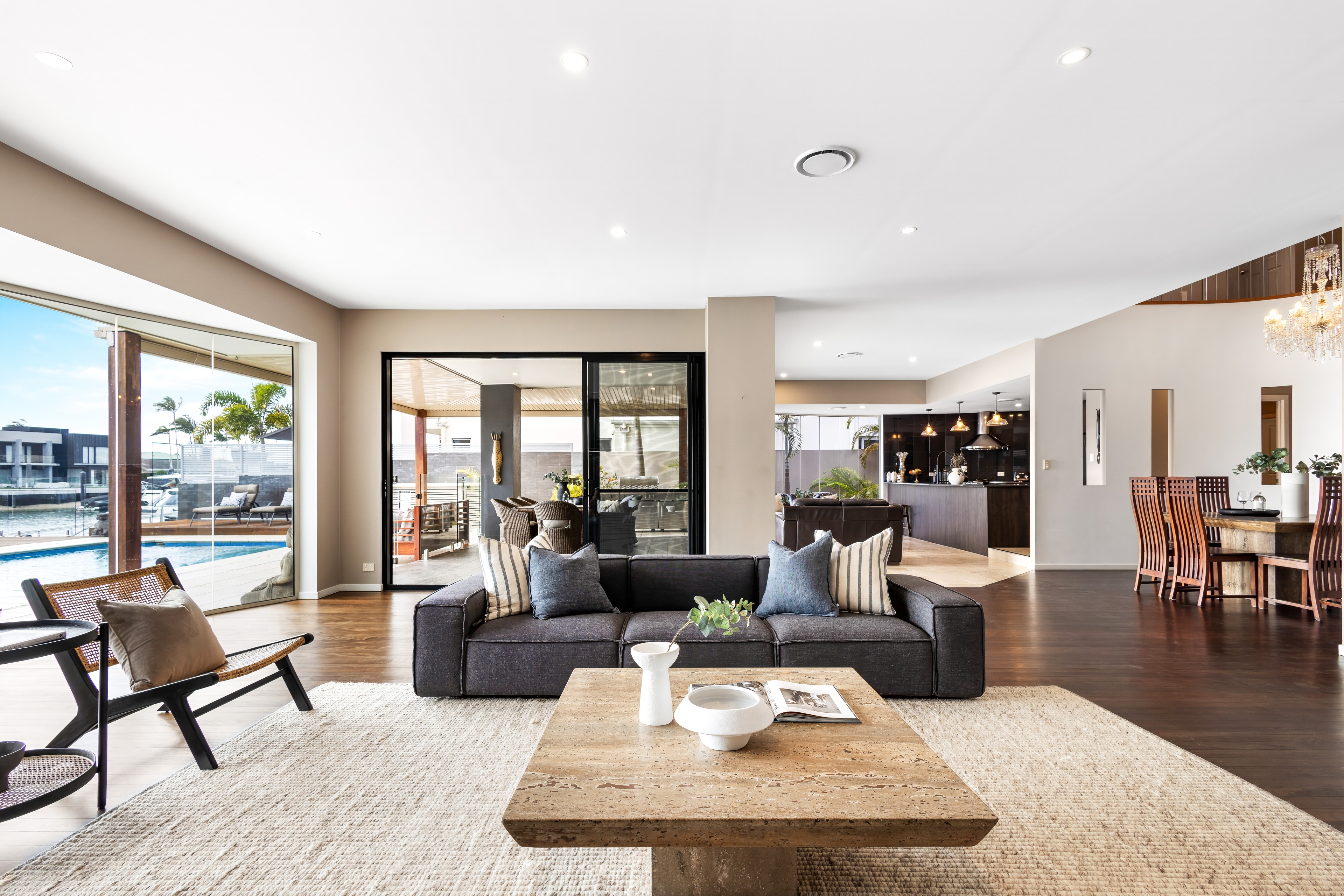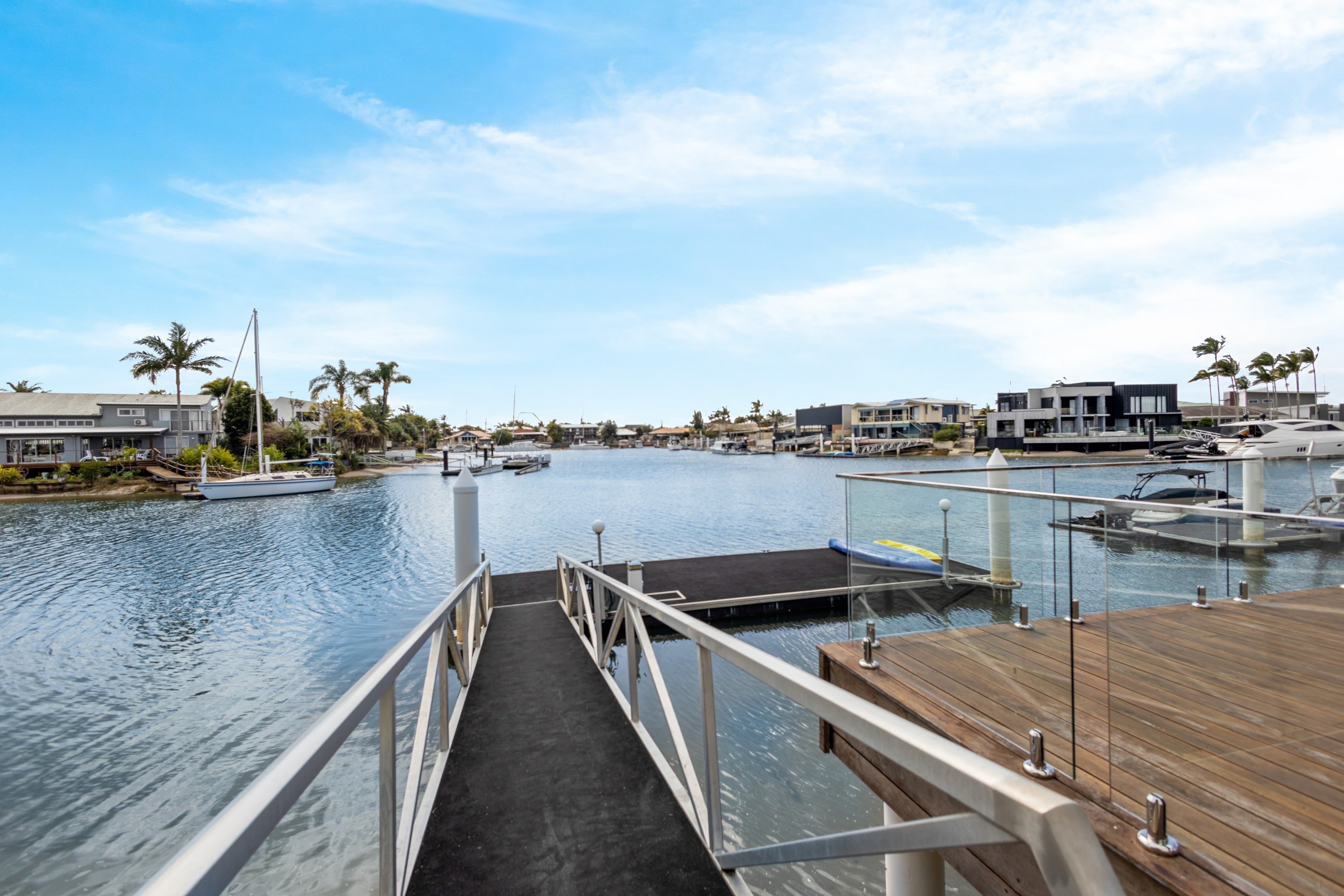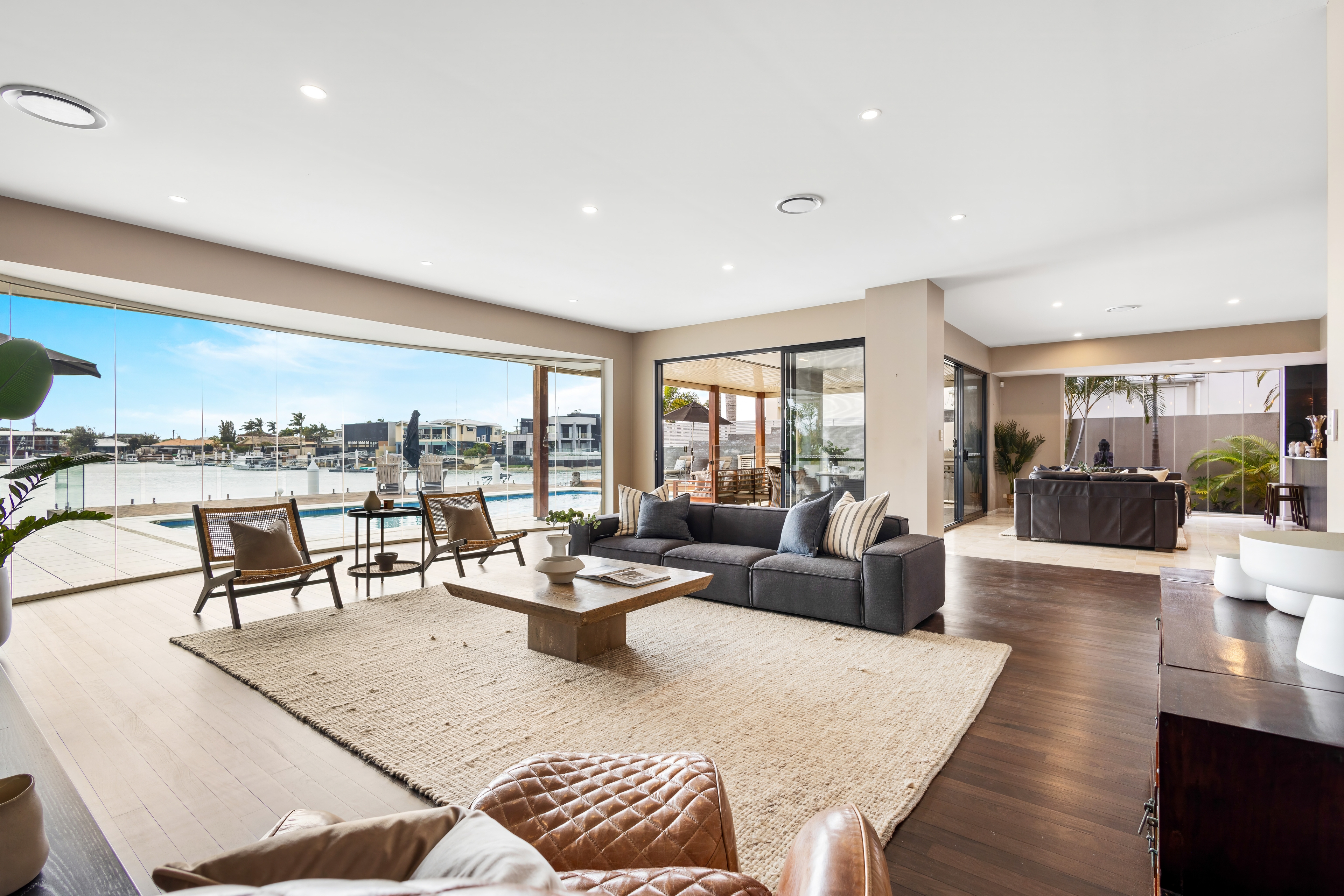 The private 13x4 meter pontoon, equipped with 3-phase power, provides the perfect spot for launching boats and jet skis, allowing you to cruise into the Coral Sea within just 10 minutes. Inside, the home spans 470m² of sophisticated living space on an 808m² deepwater parcel, featuring high ceilings and expansive windows that flood the interior with natural light.