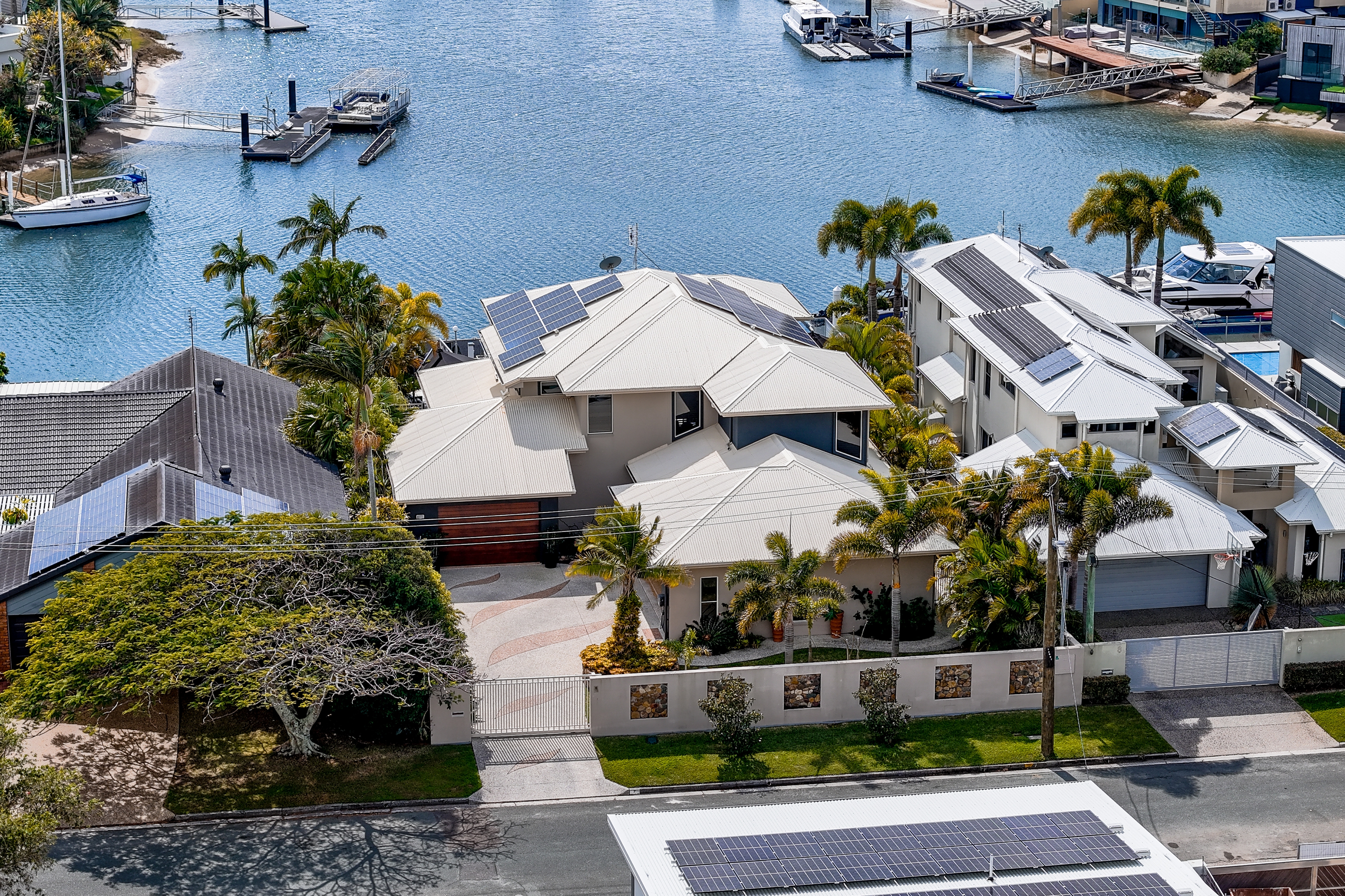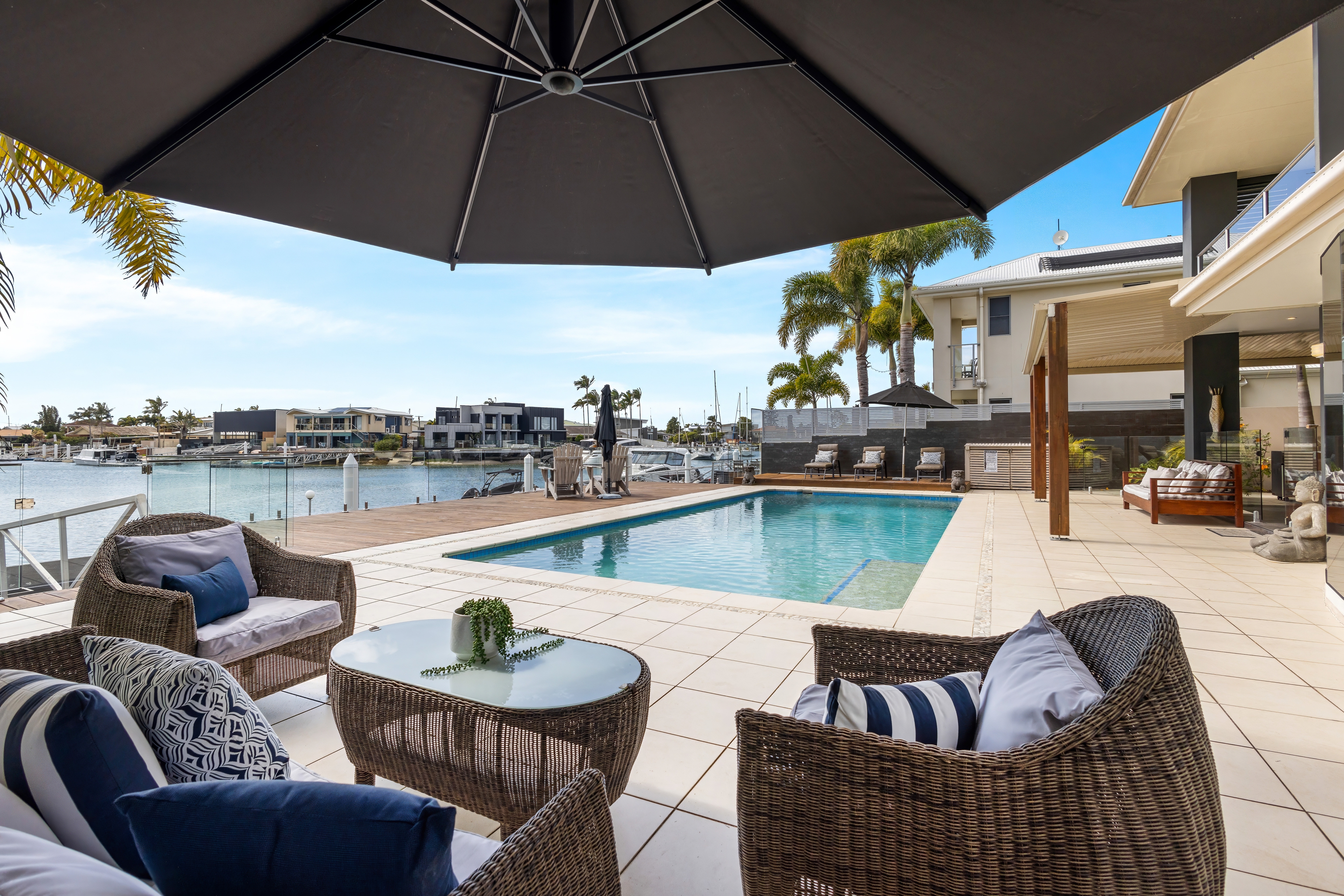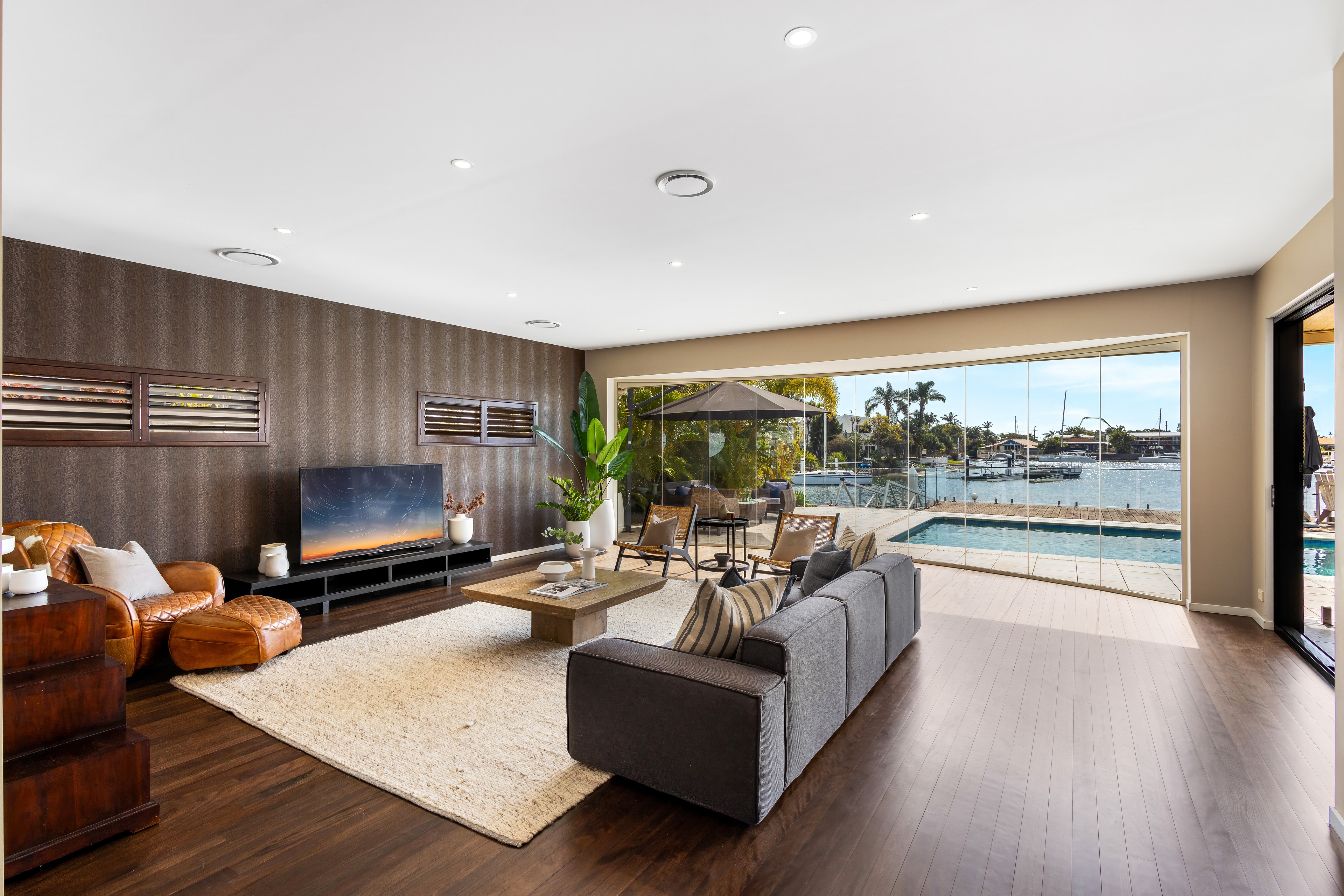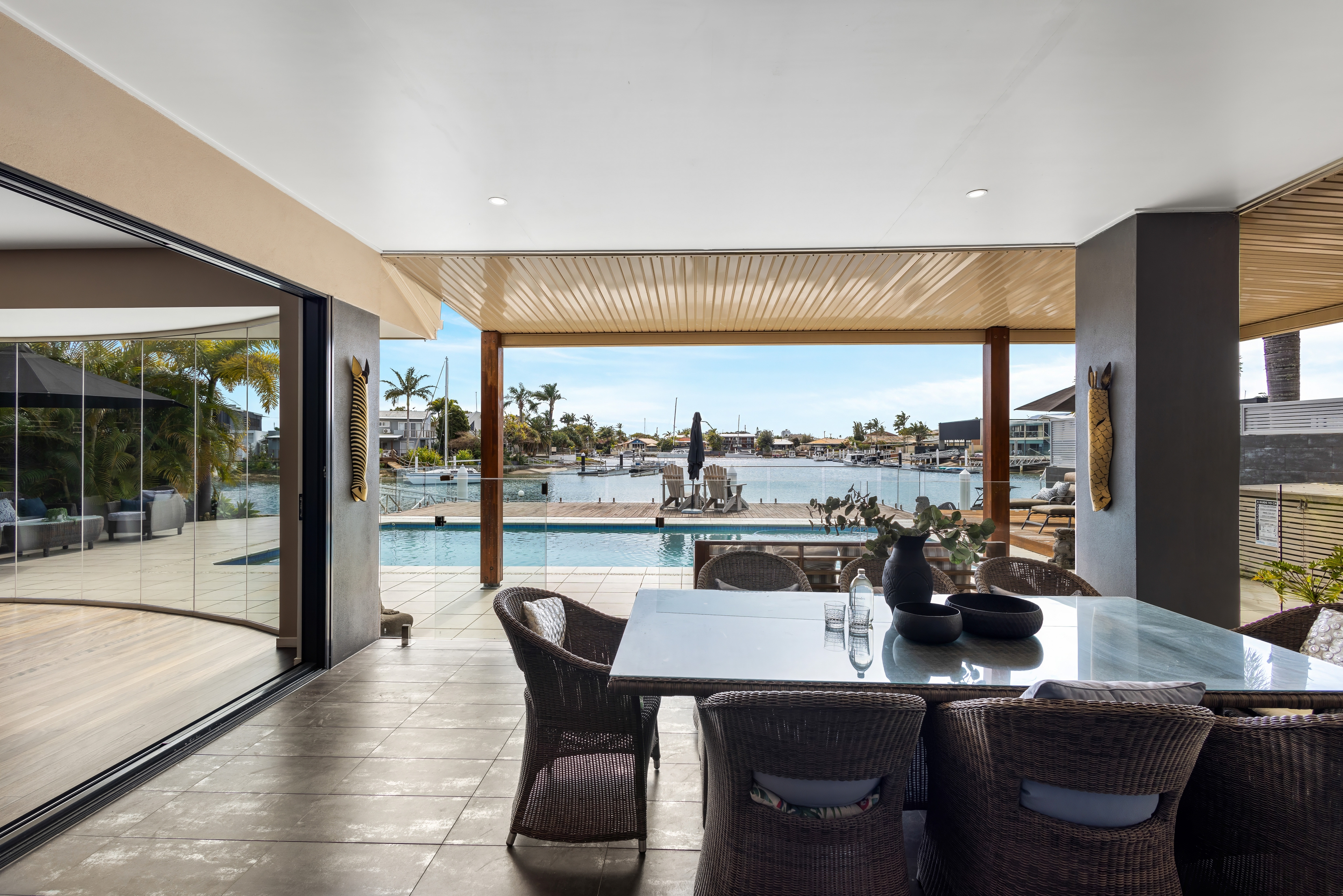 The private 13x4 meter pontoon, equipped with 3-phase power, provides the perfect spot for launching boats and jet skis, allowing you to cruise into the Coral Sea within just 10 minutes. Inside, the home spans 470m² of sophisticated living space on an 808m² deepwater parcel, featuring high ceilings and expansive windows that flood the interior with natural light.