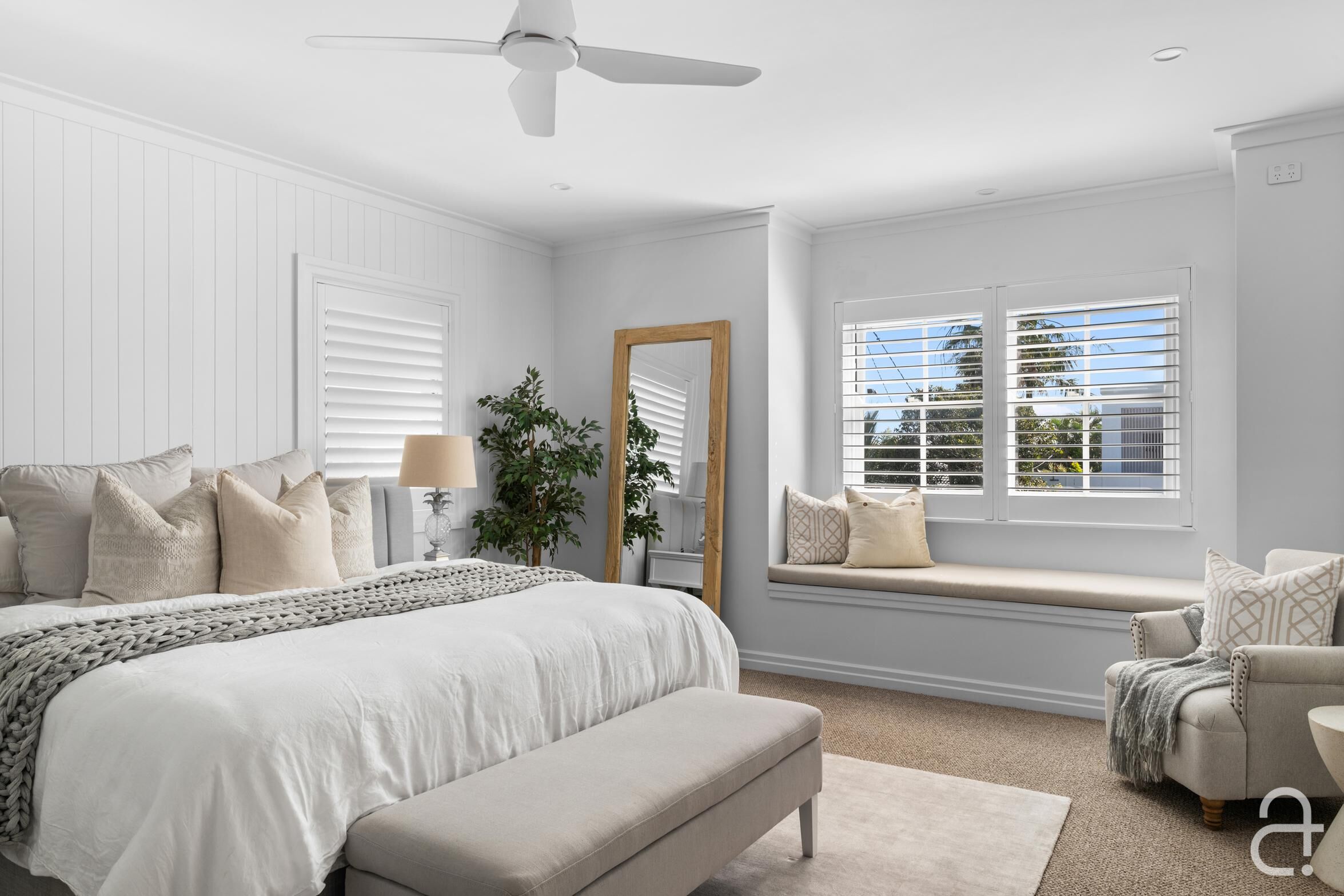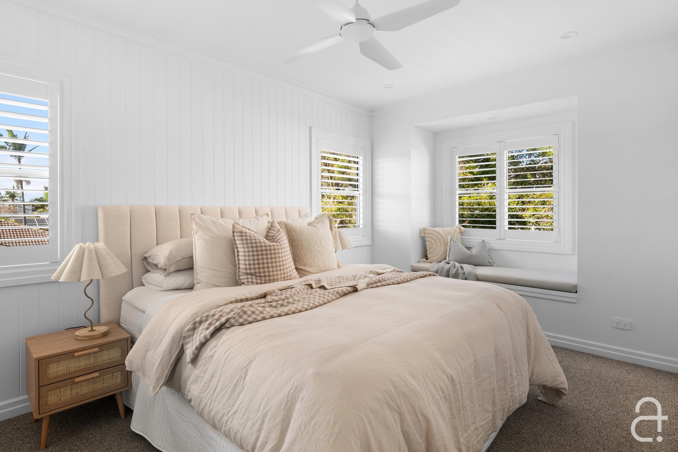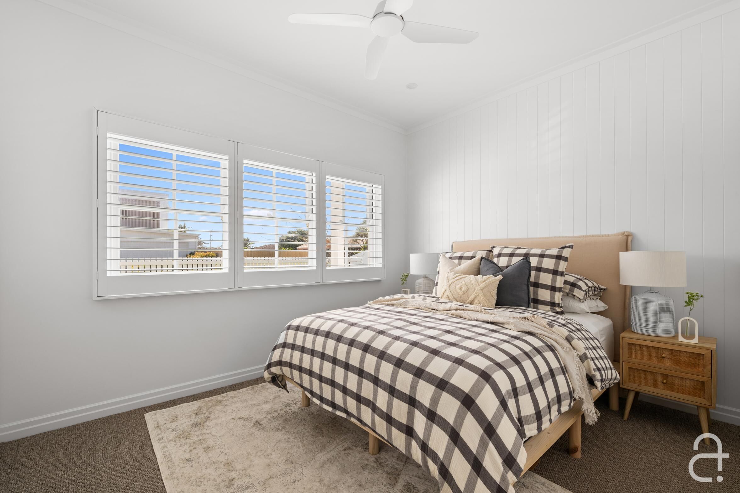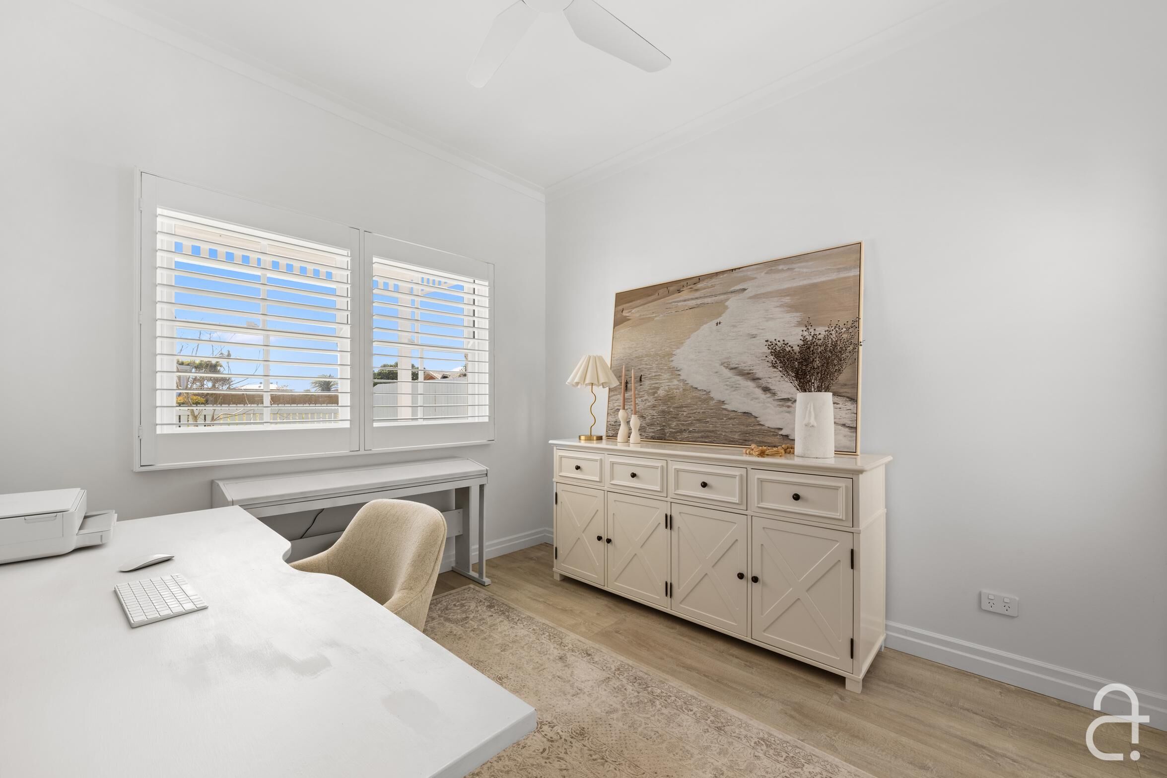• Classic style completed by a white picket fence, plantation shutters, built in custom cabinetry soothing neutral colours, timeless finishes and quality fixtures • Ducted air-conditioning, ceiling fans, solar power • Short stroll to the beach, coastal pathway, playgrounds and B-Fresh complex