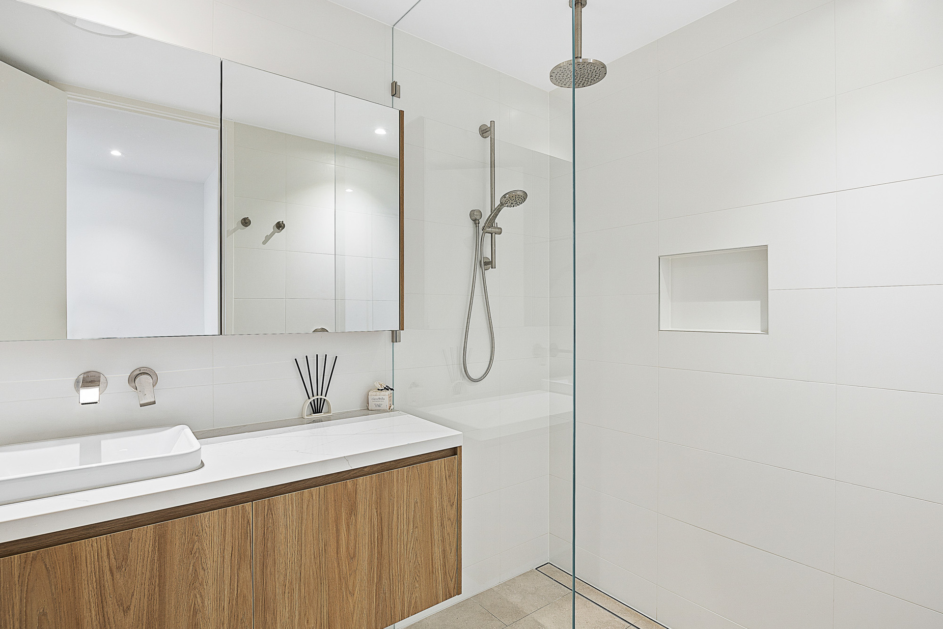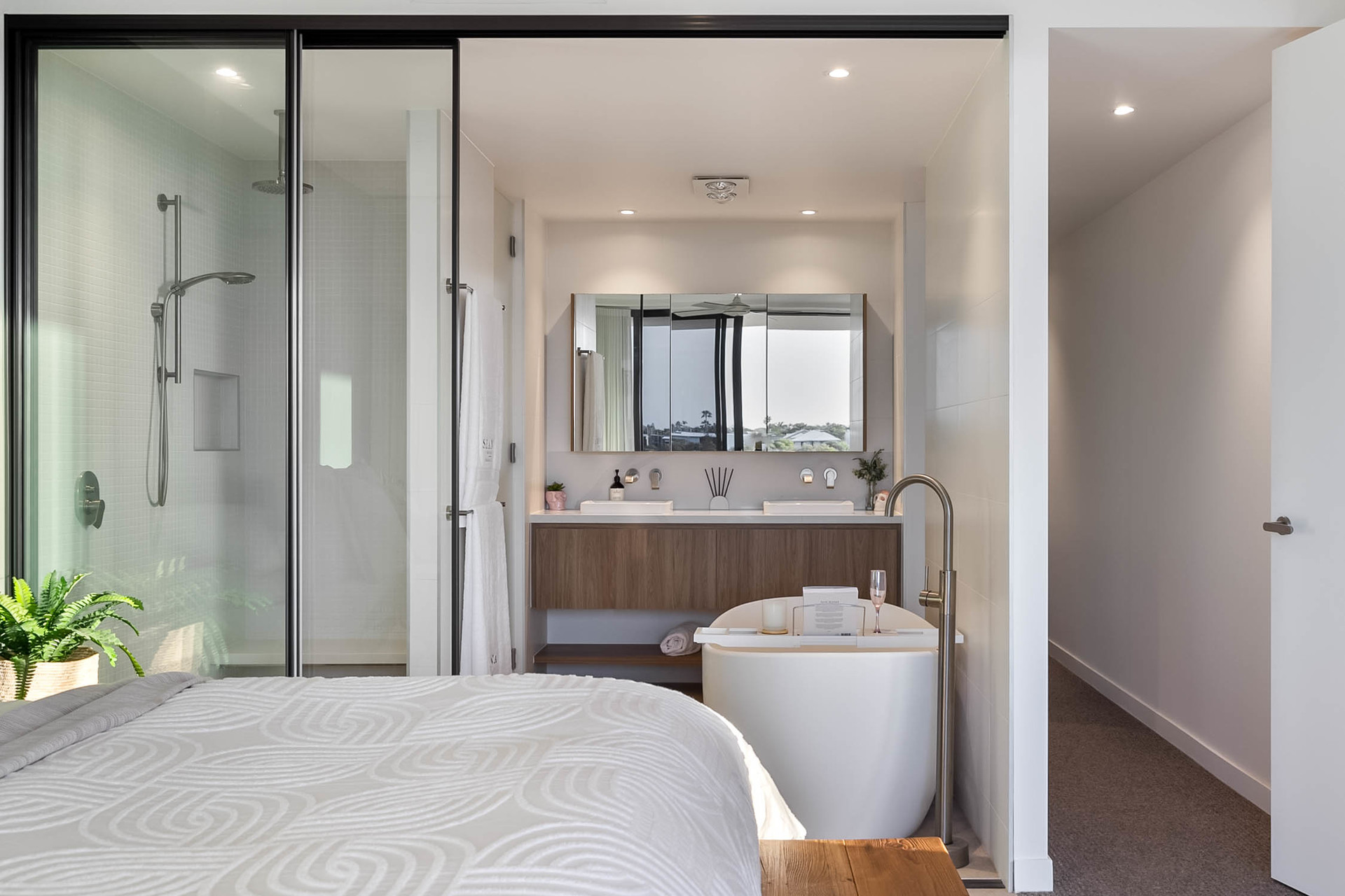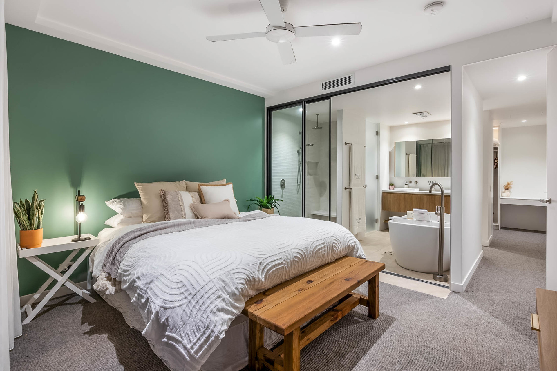 The apartment's sleeping quarters comprise three spacious bedrooms, all featuring generous storage options. The master suite, with its own ensuite & walk in robe, is a private sanctuary designed for comfort and relaxation. Ducted air-conditioning and ceiling fans ensure a pleasant climate year-round, enhancing the abode's innate allure.