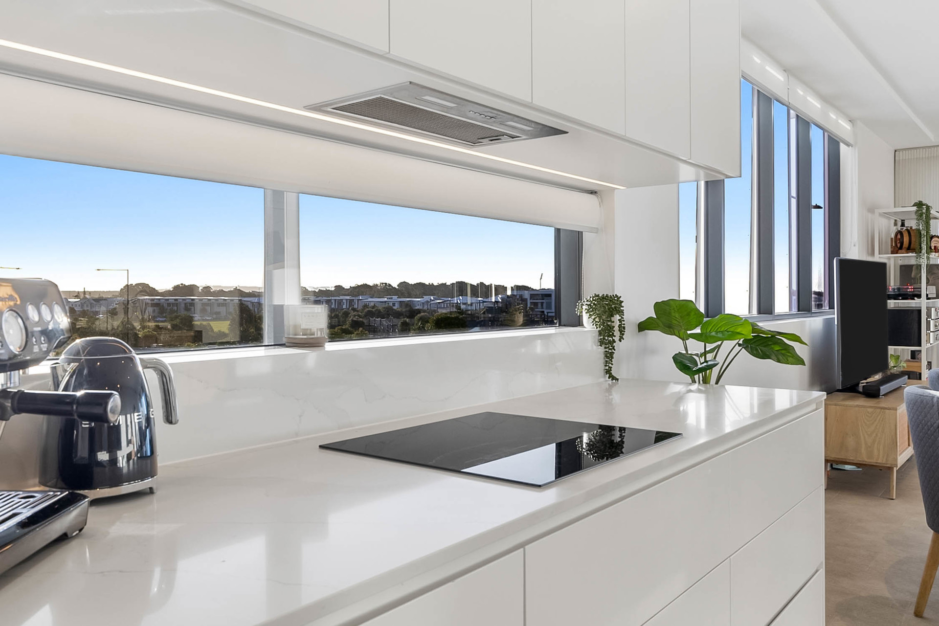 Upon entering, one is immediately greeted by a gourmet kitchen that boasts elegant stone benches, ready to inspire culinary creativity. The kitchen seamlessly flows into an open-plan living area, adorned with natural light and luxury finishes. This central space extends onto an expansive balcony, a perfect backdrop for entertaining or quiet contemplation.